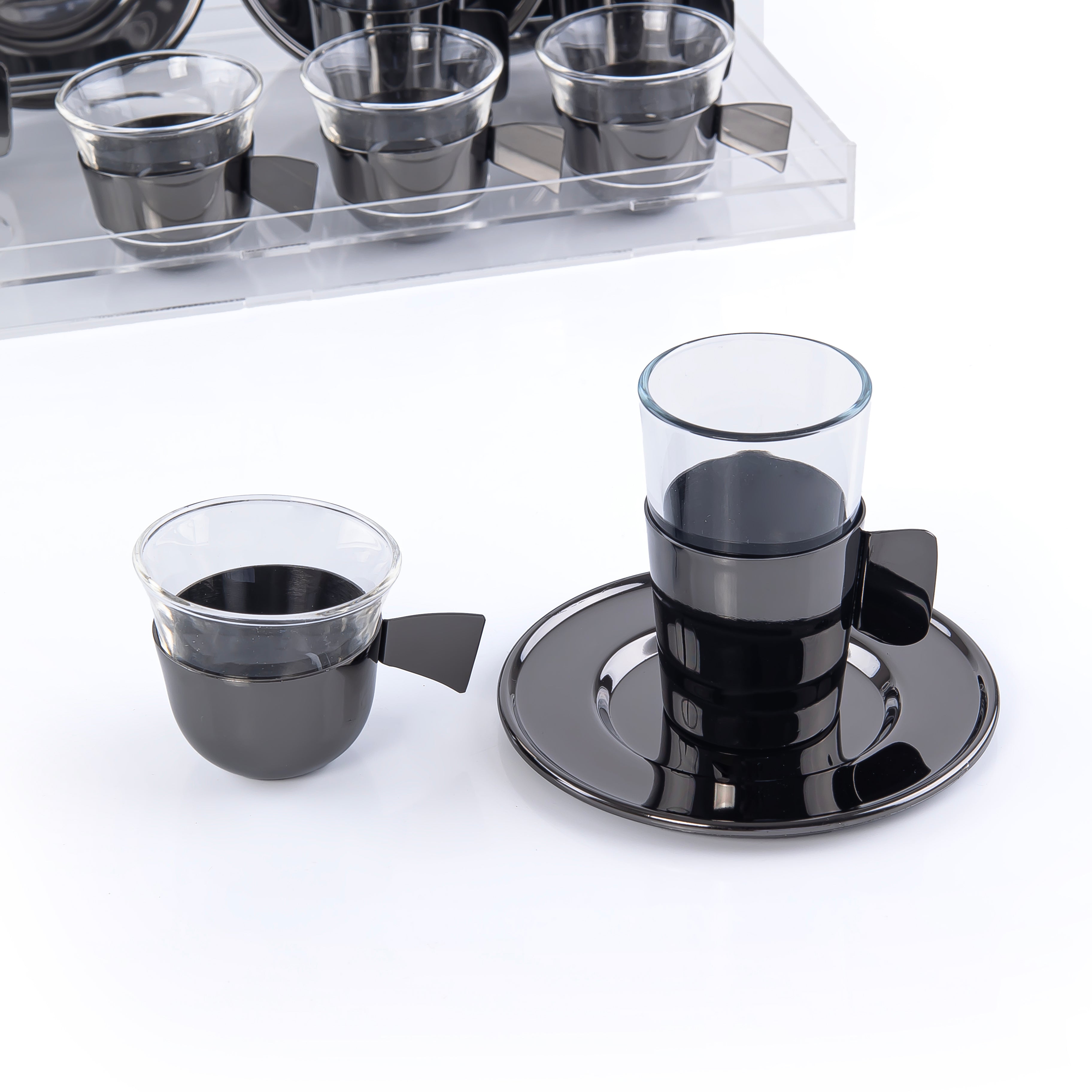 اختر الخيار: طقم مكون من 6 إستكانات و 6 فناجين قهوة مع 6 أطباق وبوكس أكريليك - أسود