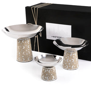 قدمي لضيوفك ألذ الأطباق بشكل يعكس فخامة اختياراتك باقتناء طقم استاندات المعدن. ذات تصميم جمالي مذهل للغاية. مصنوع من خامات عاليه الجوده لضمان الاستدامه وآمنه للطعام كما أنها متينة وسهلة التنظيف ذات قاعده صدف راقيه مما يجعلها قطعة فريدة لاغنى عن اقتنائها