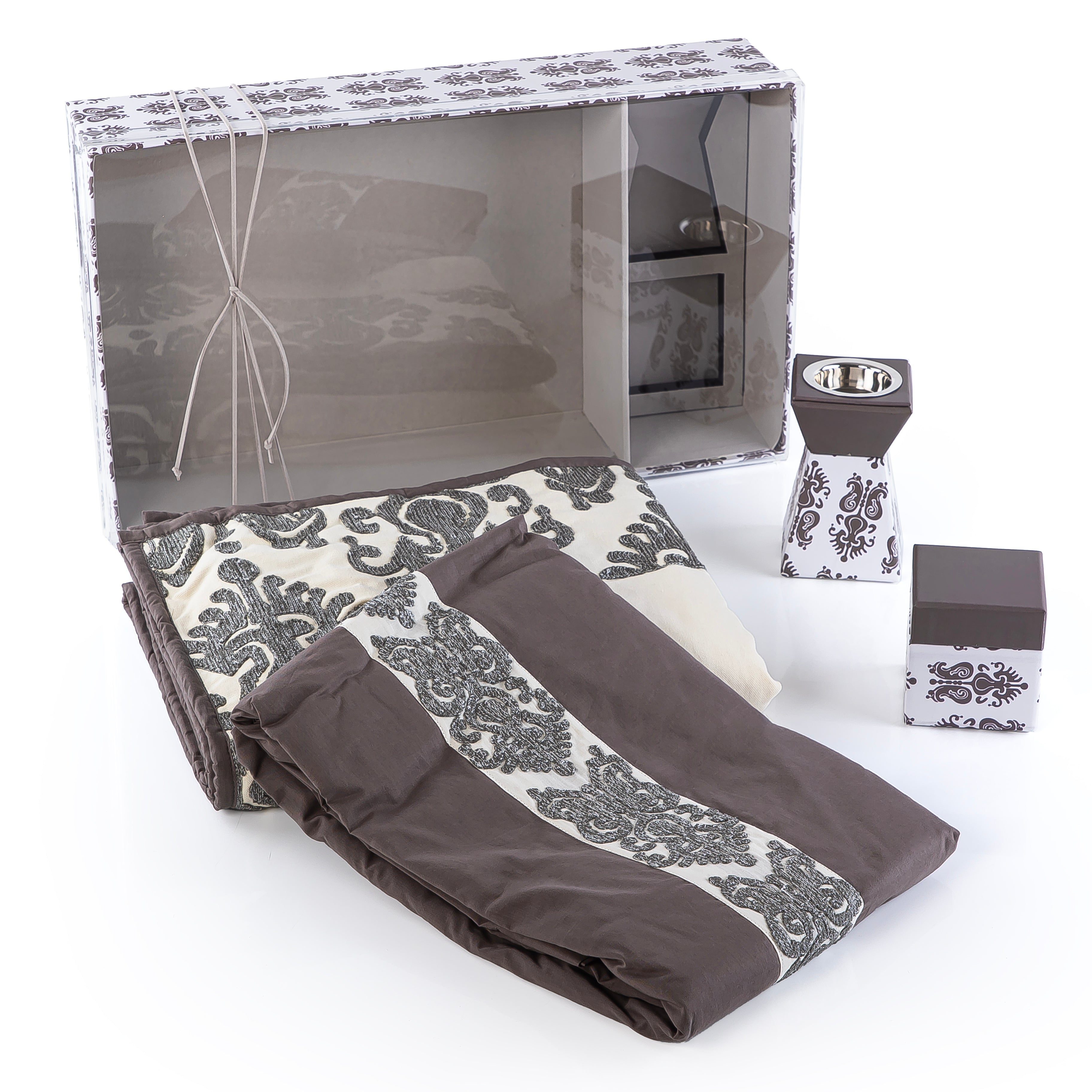 مبخرة، صندوق بخور، سجادة صلاة، ثوب صلاة، سجادة صلاة، جميعها في علبة كرتون بغطاء أكريليك، مغلفة بورق رمادي داكن مطبوع.