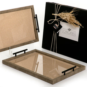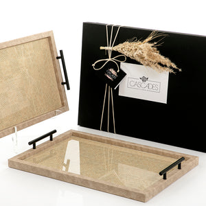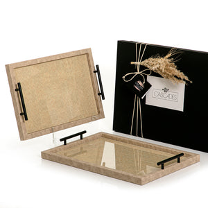 أضيفي لمسة أناقة وترتيب إلى ديكور منزلكِ باقتناء طقم الصواني الرائع المصنوع من خامات عالية الجودة فاخره تأتي بسطح اكريليك قابل للازاله انيق تضمن استدامتها. تتميز بتصميم جذّاب على شكل مستطيل ساحر بتفاصيل متقنة، يمكن استخدامها لتخزين الأغراض الصغيرة، ومثالية للإهداء بالاضافه الى بوكس هدايا فاخر