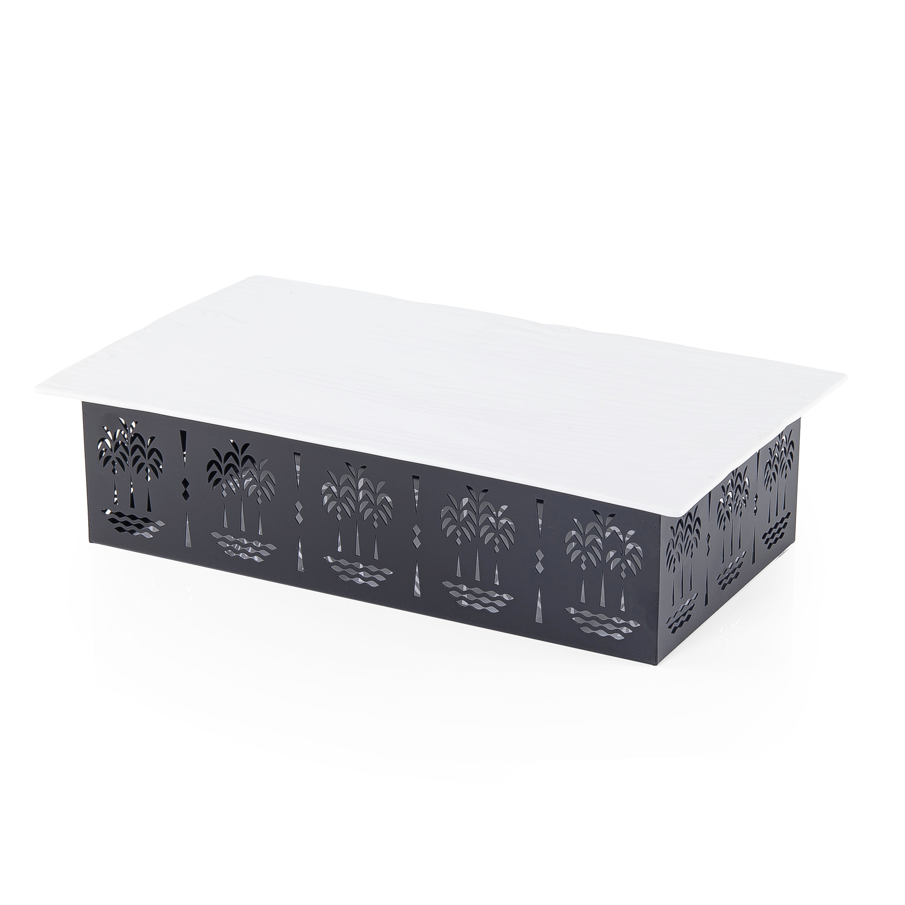 حامل تقديم أنيق بزخارف إسلامية، يحيط بقاعدته إطار فني يعكس الطابع الجمالي التقليدي. سطحه العلوي المسطح والمربع يوفر مساحة مستقرة للتقديم أو العرض. مزيج مثالي بين الوظيفة والجماليات الفنية الإسلامية التقليدية.