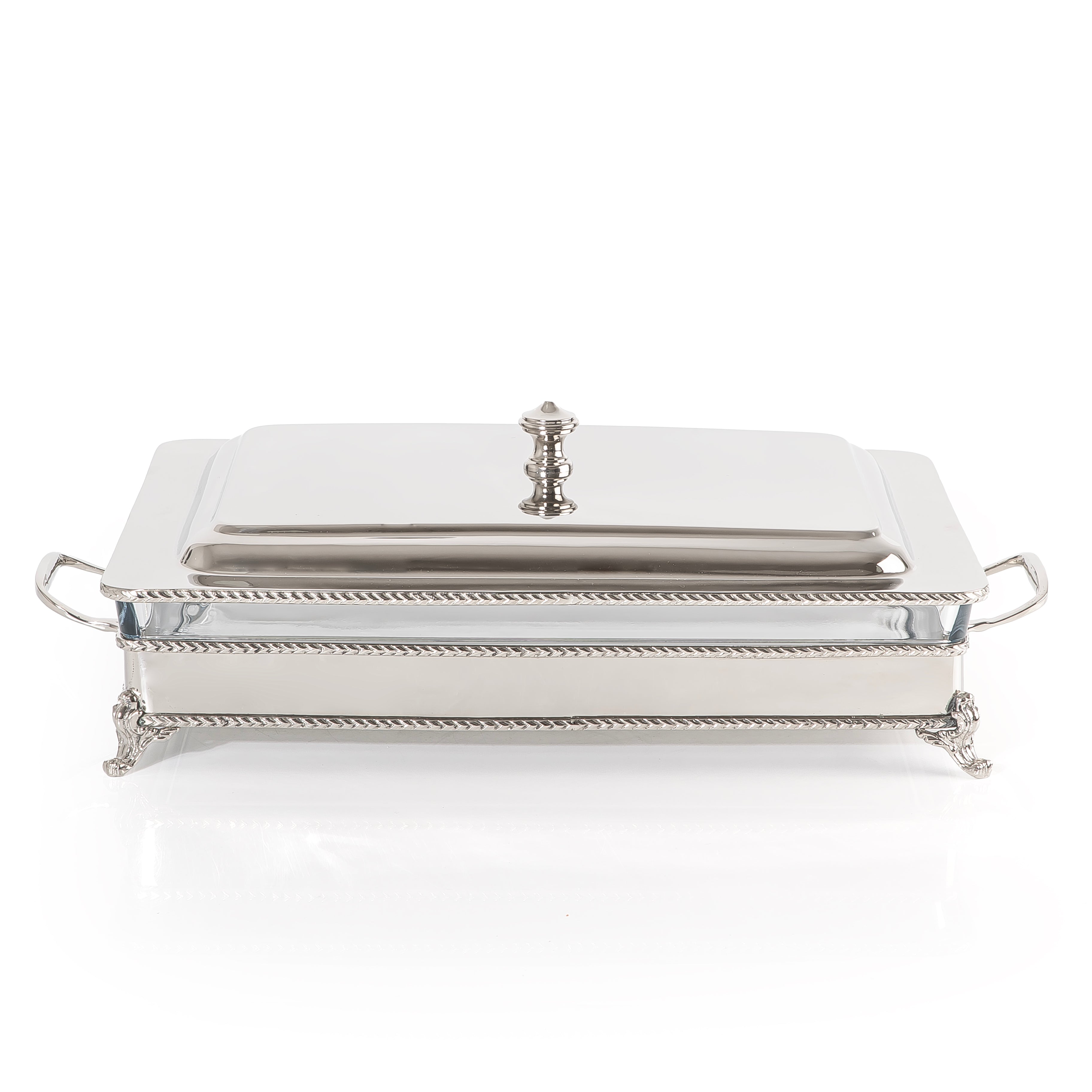ارتقِ بتجربة تقديم الطعام مع سخان الطعام المستطيل الكبير المصنوع من الستانلس ستيل الفضي، المزود بوعاء زجاجي داخلي قابل للإزالة لمرونة التقديم وسهولة التنظيف.