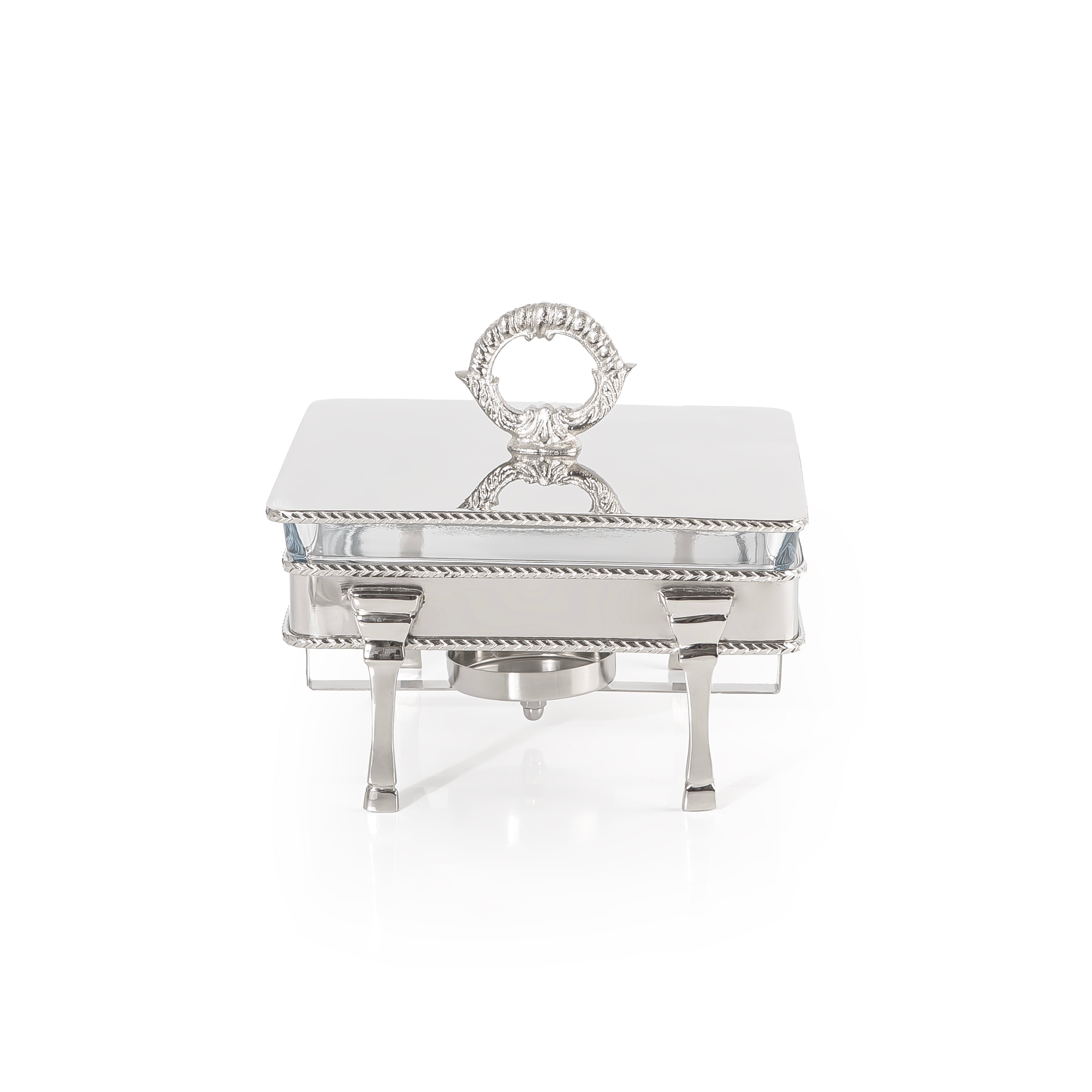 أضف لمسة من الأناقة والعملية إلى مائدتك مع سخان الطعام المربع المصنوع من الستانلس ستيل الفضي، المزود بوعاء زجاجي داخلي قابل للإزالة لسهولة التقديم والتنظيف، بالإضافة إلى مقبض مريح للحمل والاستخدام السهل.