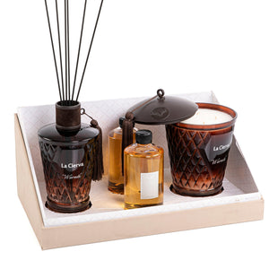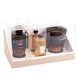 مجموعة لا سيرفا تتكون من موزع روائح عطرية سعة 650 مل مع عطرين وشمعة، داخل علبة كرتونية بغطاء أكريليك.