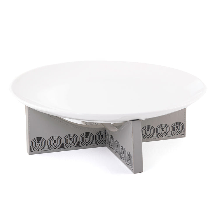Elevate your space with our designer printed wooden stand. Crafted with dark smoke grey leather and accented with a round ceramic plate, this stand adds a touch of sophistication to any room.