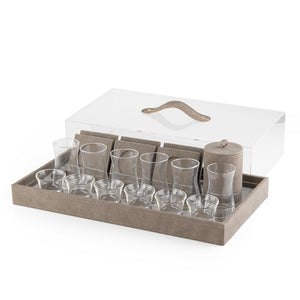 A wooden serving tray covered with leather, featuring a clear acrylic lid and a convenient handle. The set includes 6 tea cups, 6 coffee cups, and comes in a gift box.