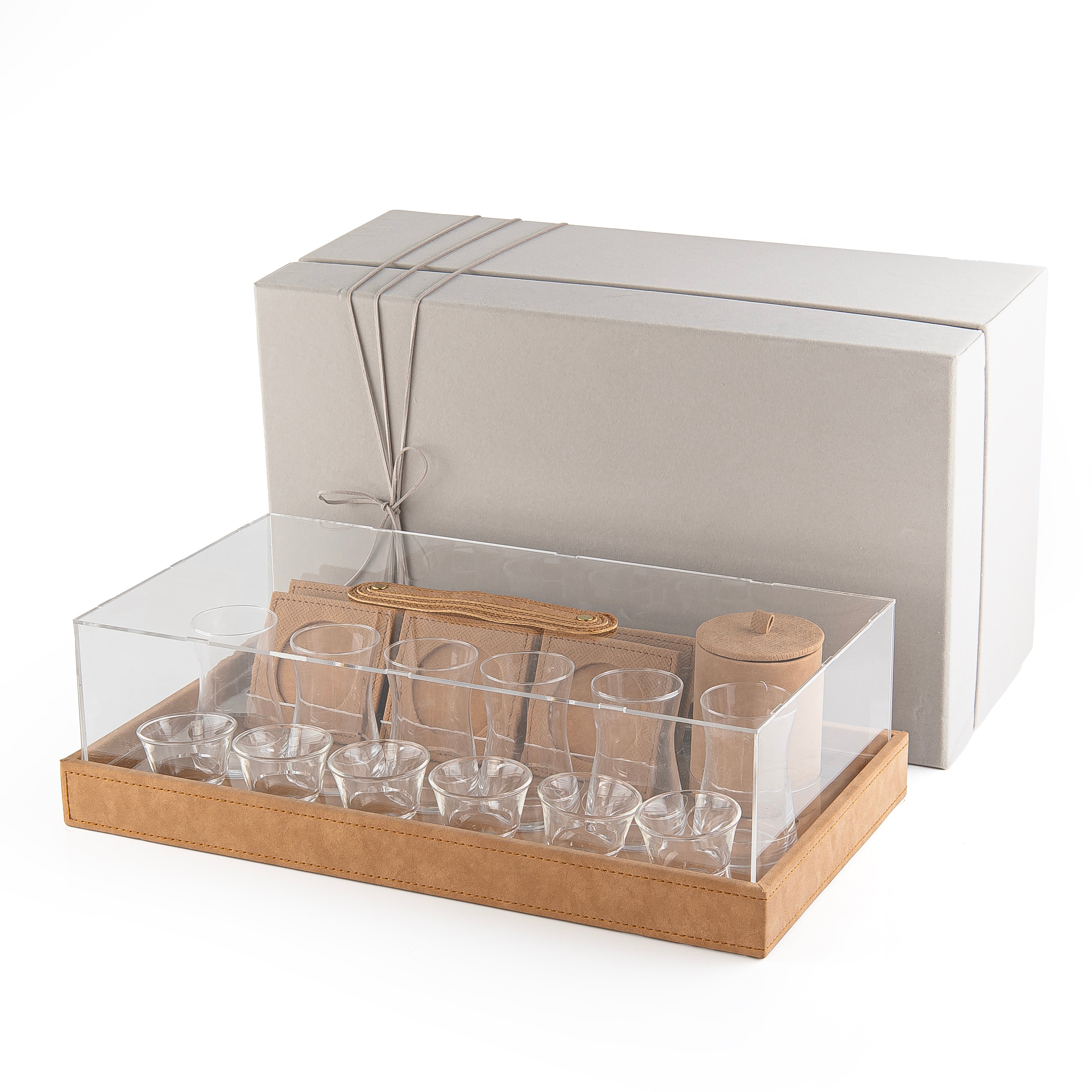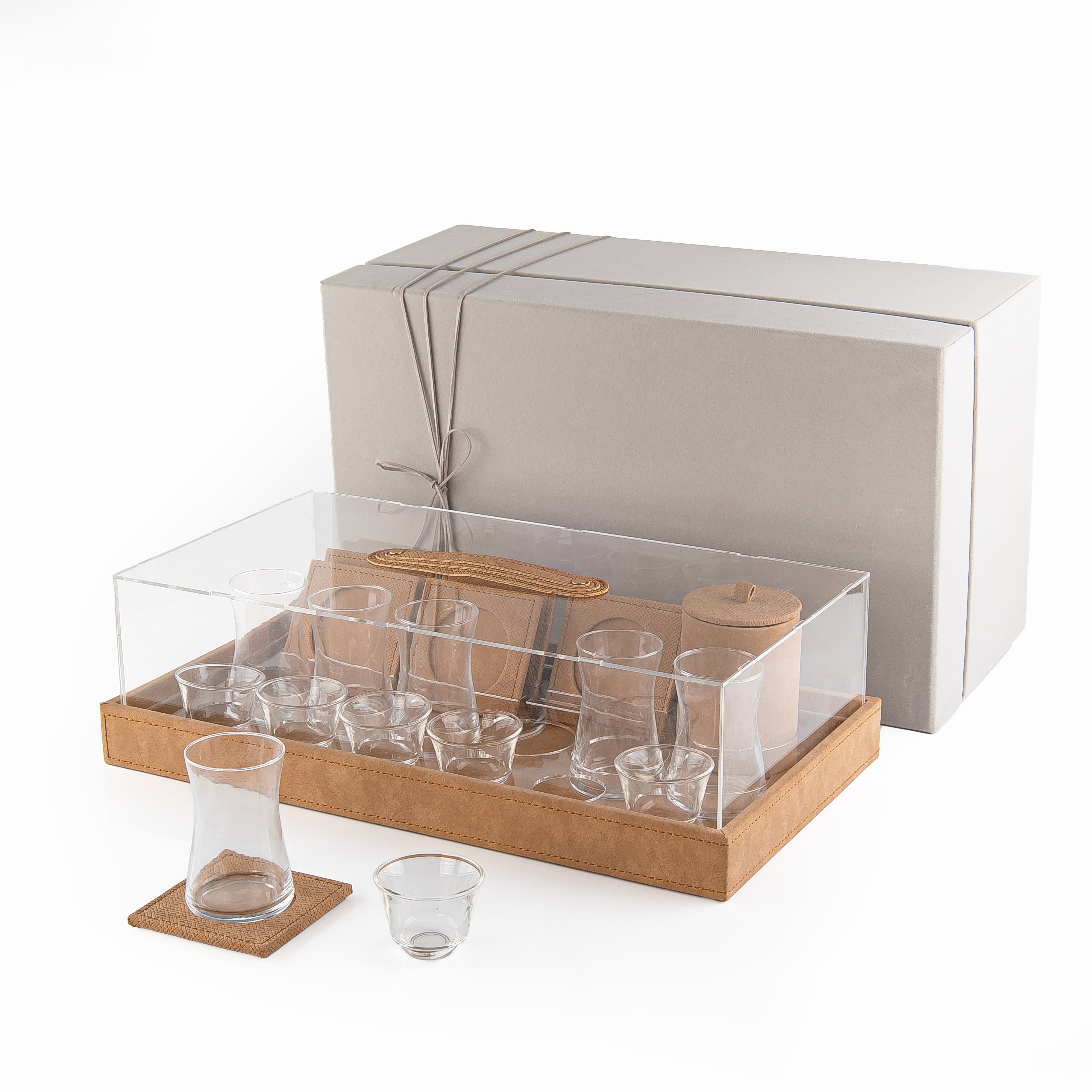 A wooden serving tray covered with leather, featuring a clear acrylic lid and a convenient handle. The set includes 6 tea cups, 6 coffee cups, and comes in a gift box.