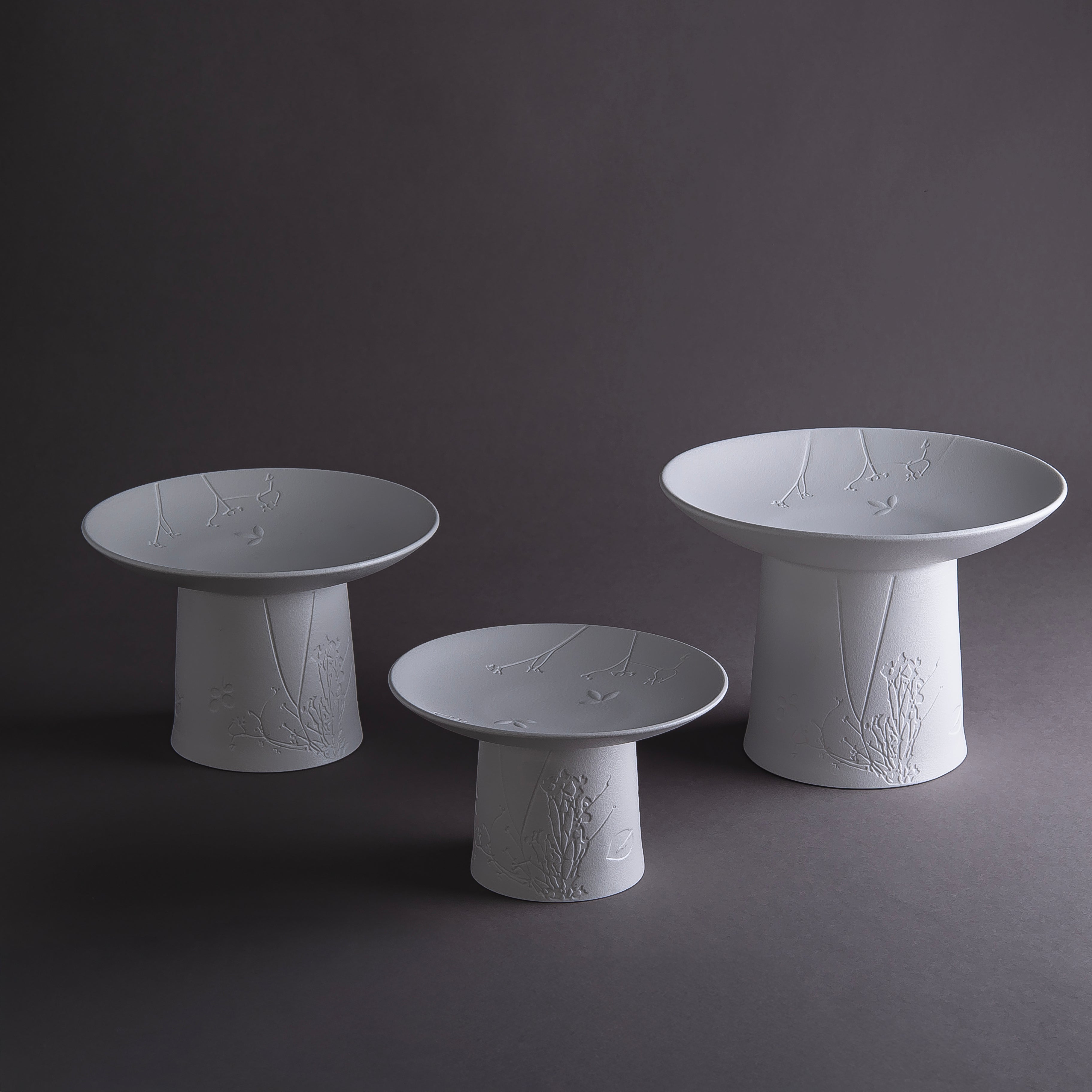 Elevate your table presentation with this refined set of three matte white ceramic serving stands. Each piece combines understated elegance with practical functionality, perfect for displaying appetizers, desserts, or decorative elements at gatherings. The soft, sophisticated finish complements any décor style while the tiered design adds visual interest and maximizes serving space. Thoughtfully packaged in a gift box, this collection makes an exceptional present for those who appreciate refined entertaining essentials.