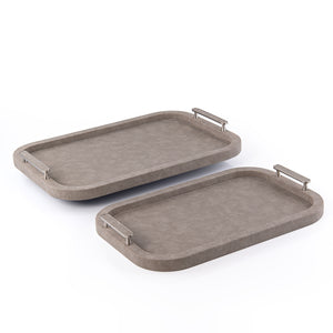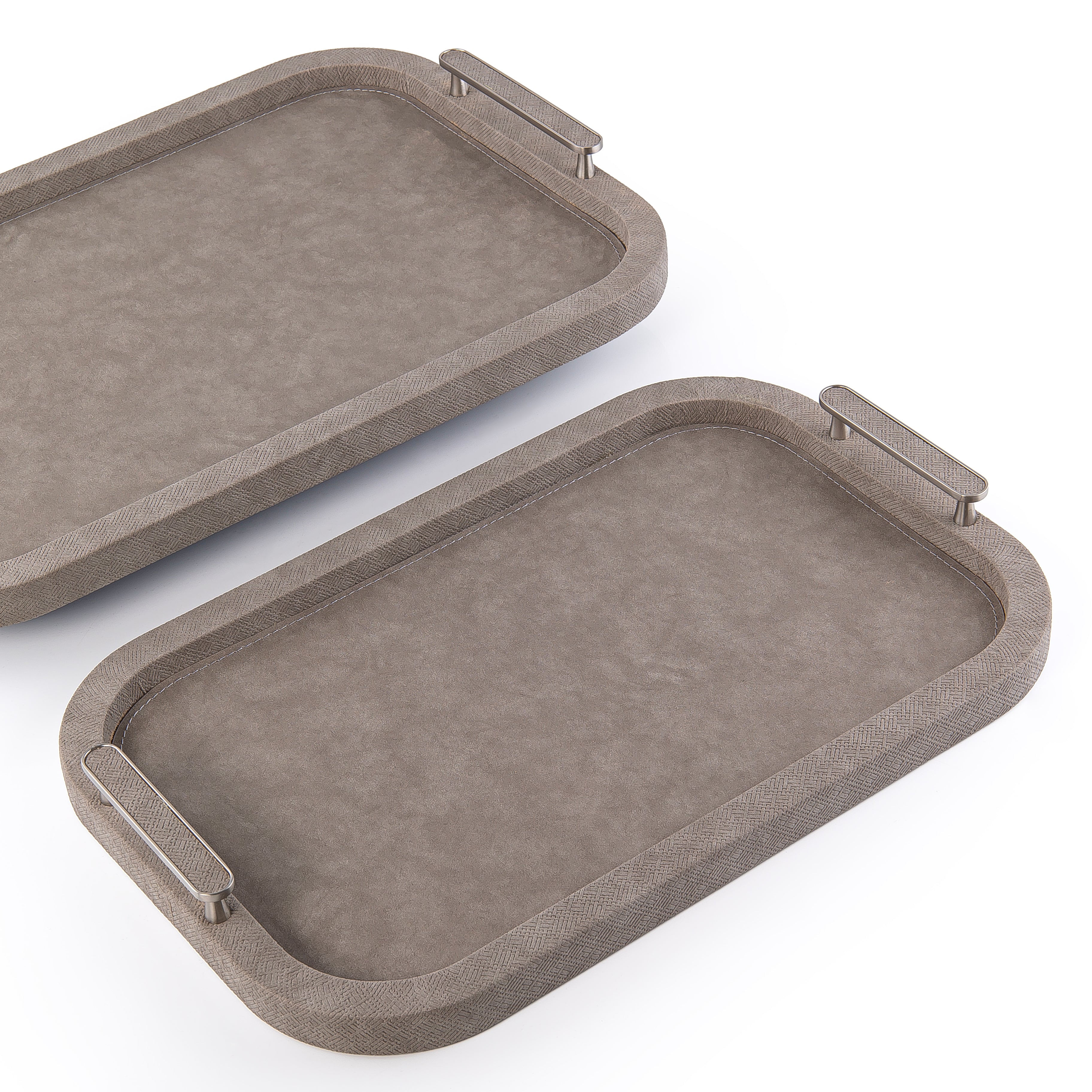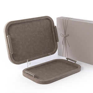 Elevate your home décor with this refined set of two leather trays, each meticulously crafted to complement contemporary and classic interiors alike. The supple wood is covered with leather construction offers both durability and timeless elegance, while the silhouette provides versatile styling for entryways, coffee tables, or bedroom surfaces. Perfect for organizing essentials or displaying decorative pieces, these trays seamlessly blend functionality with understated luxury. Presented in sophisticated packaging, this set makes an exceptional gift for those who appreciate quality craftsmanship and refined aesthetics.
