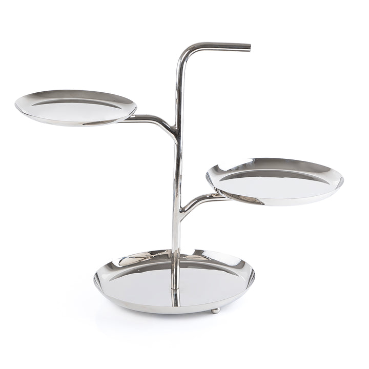 Elevate your table presentation with this sophisticated three-tier serving stand crafted from polished metal. Its gleaming finish and sturdy construction make it ideal for displaying appetizers, desserts, or decorative pieces at gatherings and events. The tiered design maximizes space while maintaining an elegant aesthetic, perfect for both formal entertaining and everyday use. A versatile addition to any dining collection.