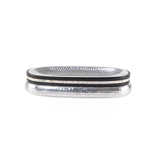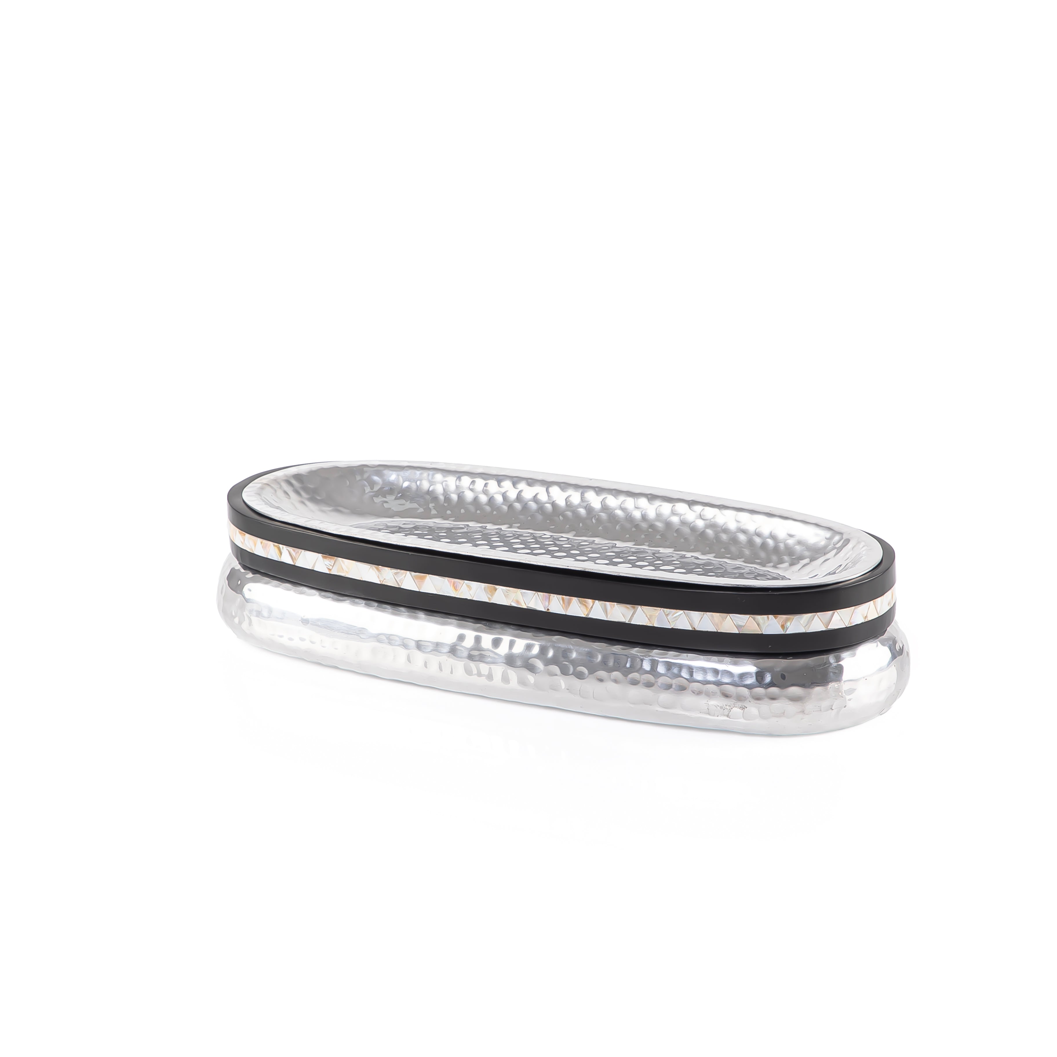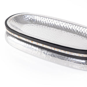 Featuring a sleek silver finish, this platter combines the durability of aluminum with the elegance of resin, making it an ideal choice for serving appetizers, desserts, or main dishes. Its elongated oval shape (41x16x7 cm) provides ample space for stylish food presentation, while its lightweight yet sturdy design ensures long-lasting use. Perfect for both home and professional catering settings.