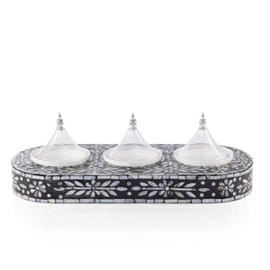 This elegant set includes a rectangular tray and 3 matching plates. Perfect for serving snacks, appetizers, or as a stylish decorative piece, this set adds a touch of sophistication to any occasion or home setting.