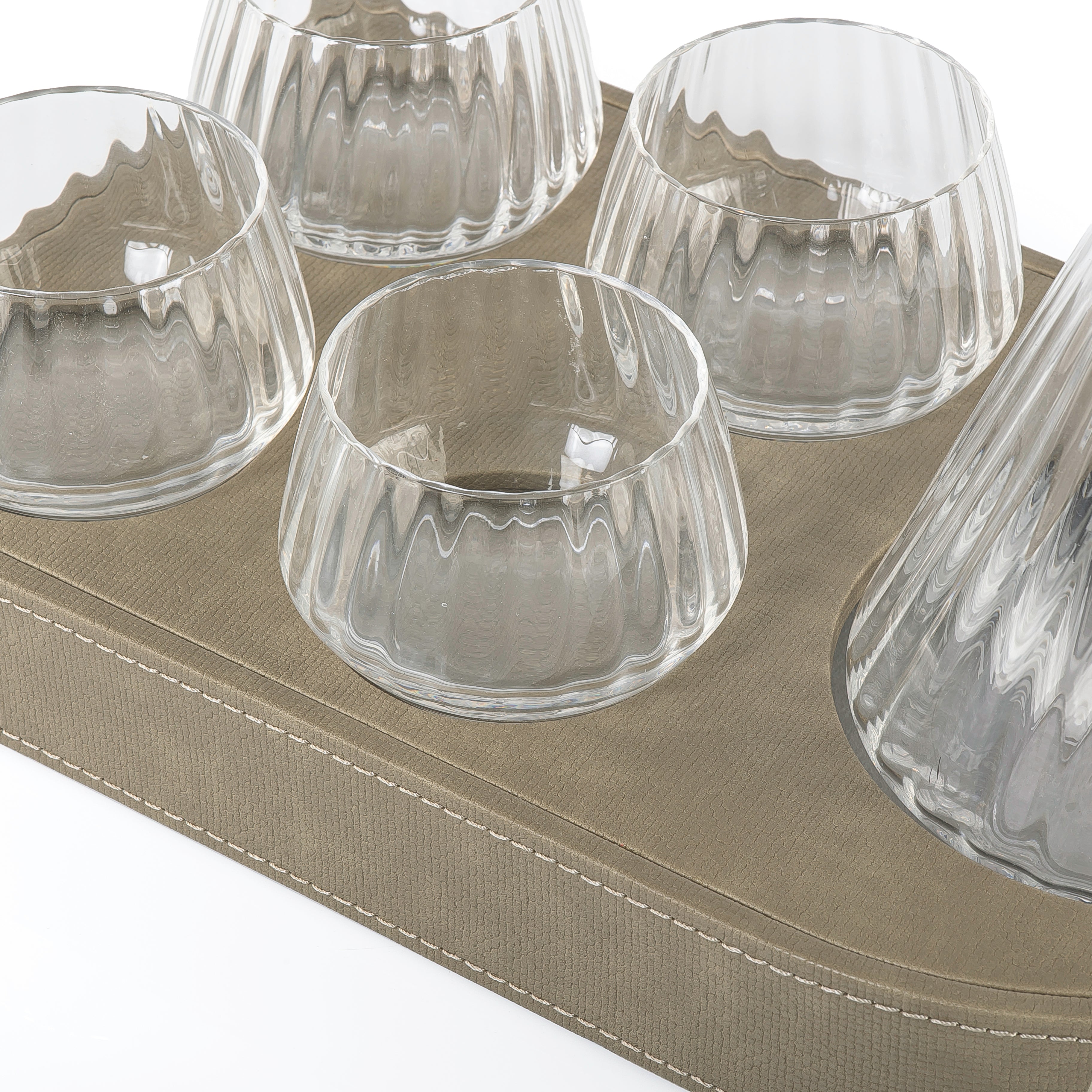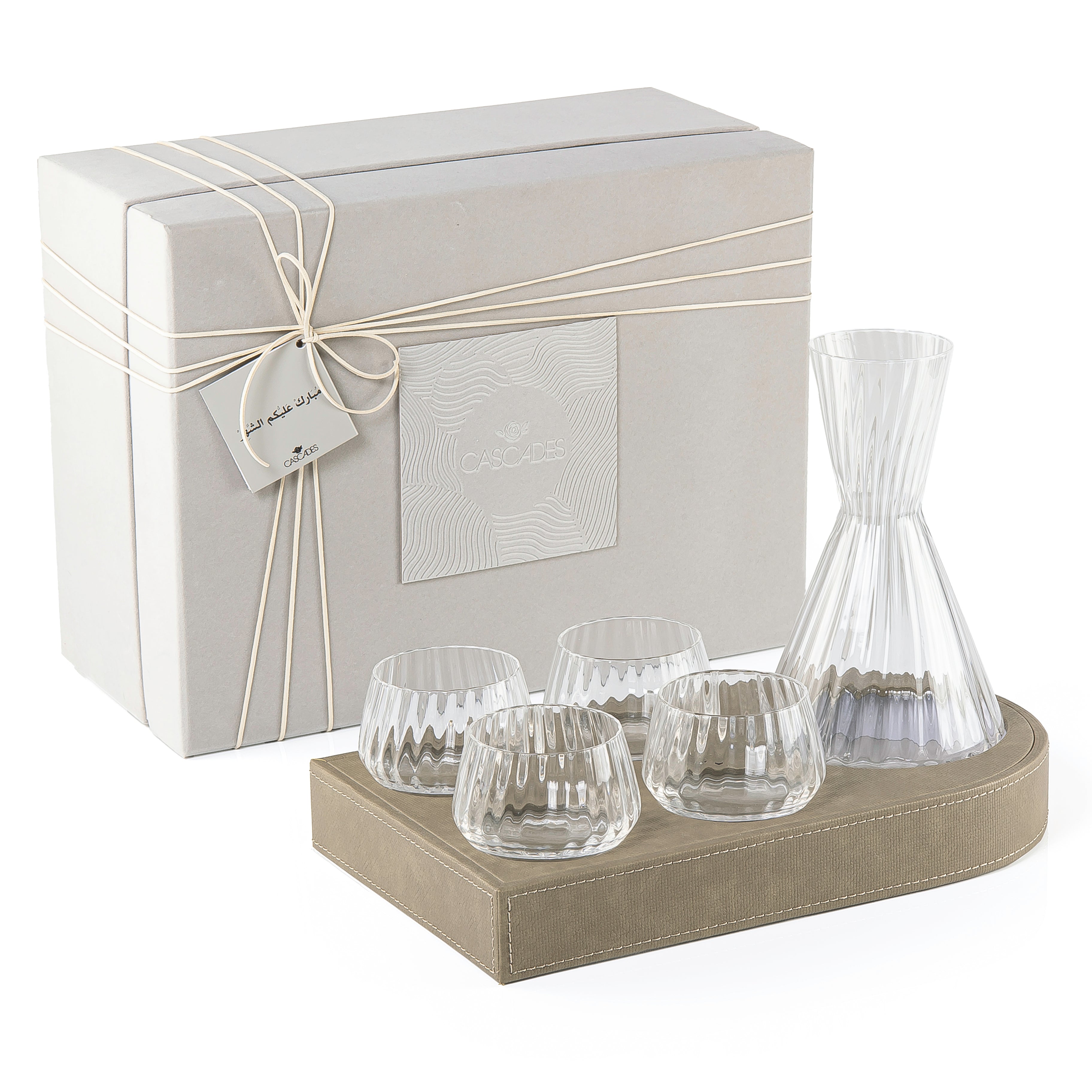 This set includes 4 glasses, a matching jug, and a stylish leather tray, all packaged in a beautiful gift box. It's perfect for serving drinks and makes an elegant gift or addition to your home.