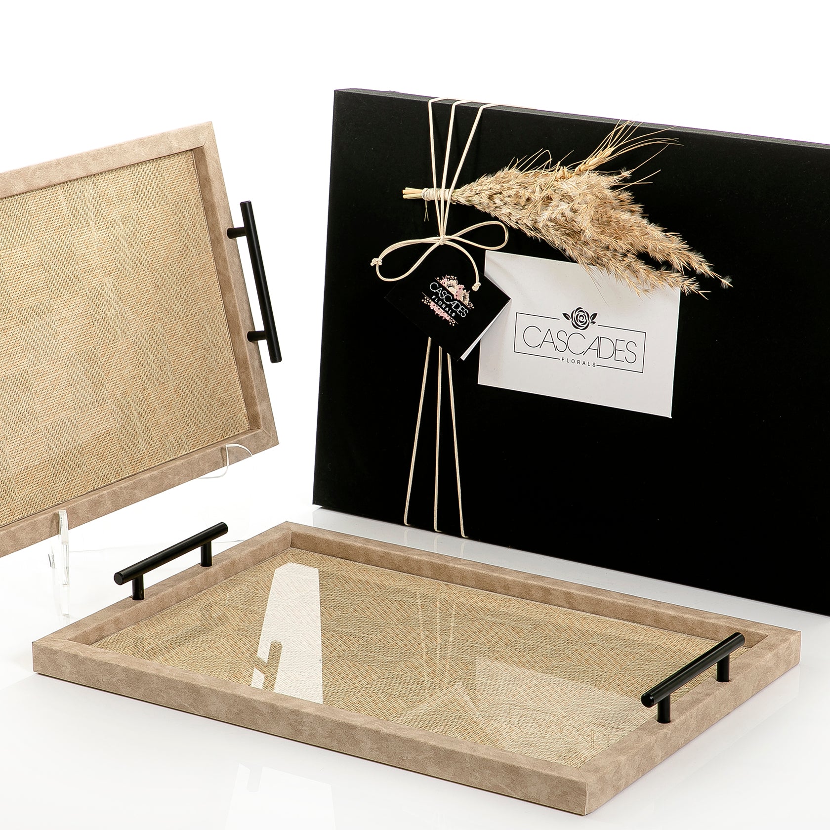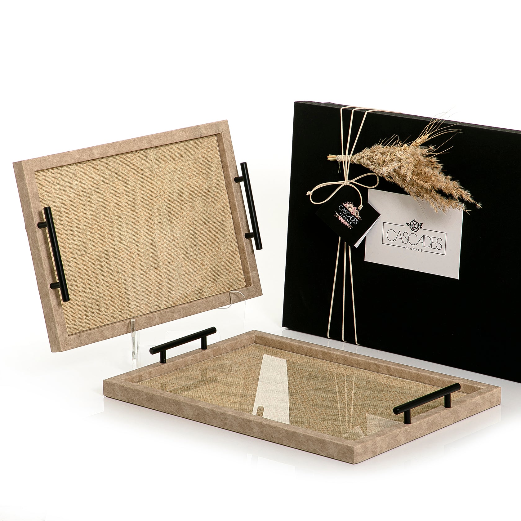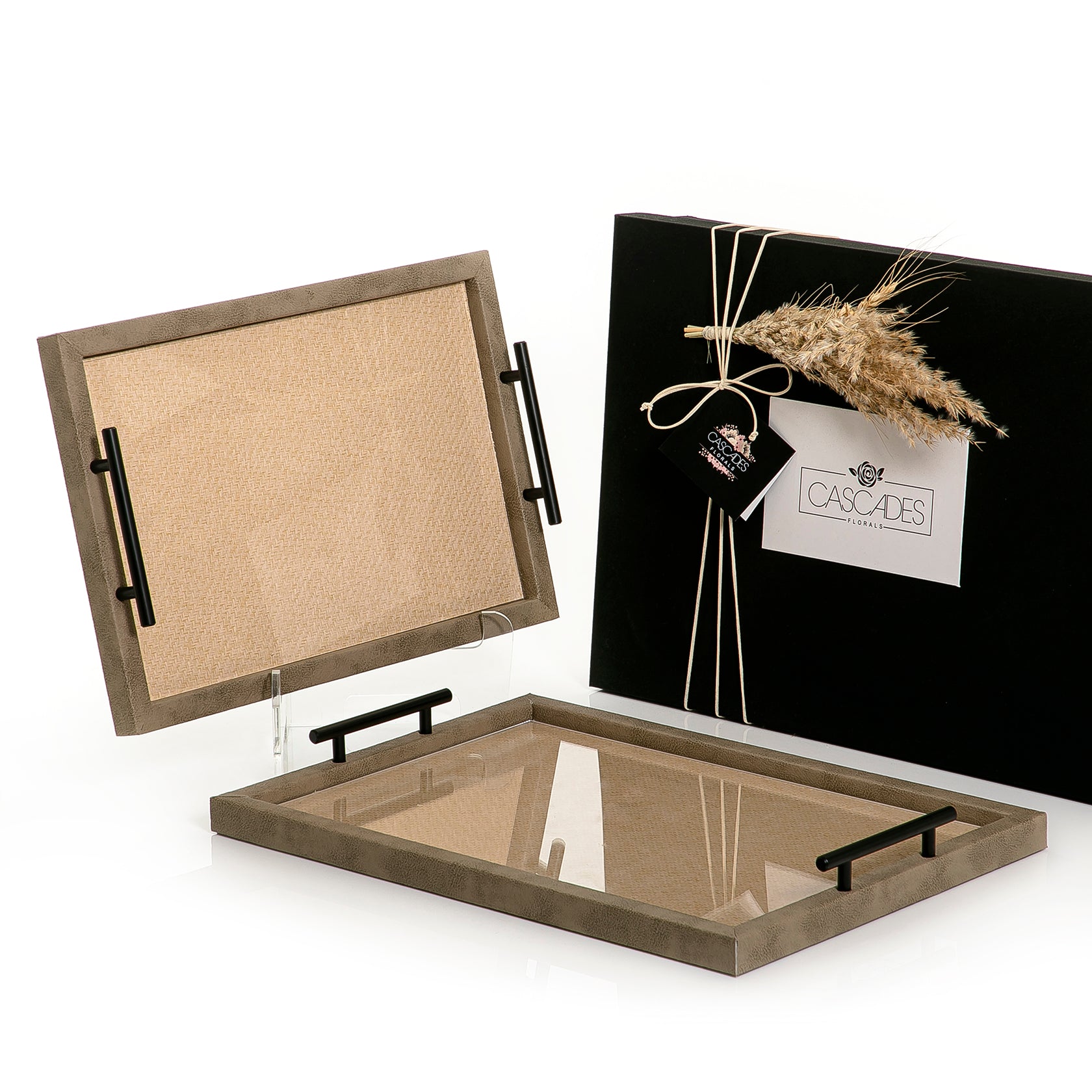 An Elegant Set Of Two Trays Made Of Leather And Rattan And removable Acrylic With A Gift Box .