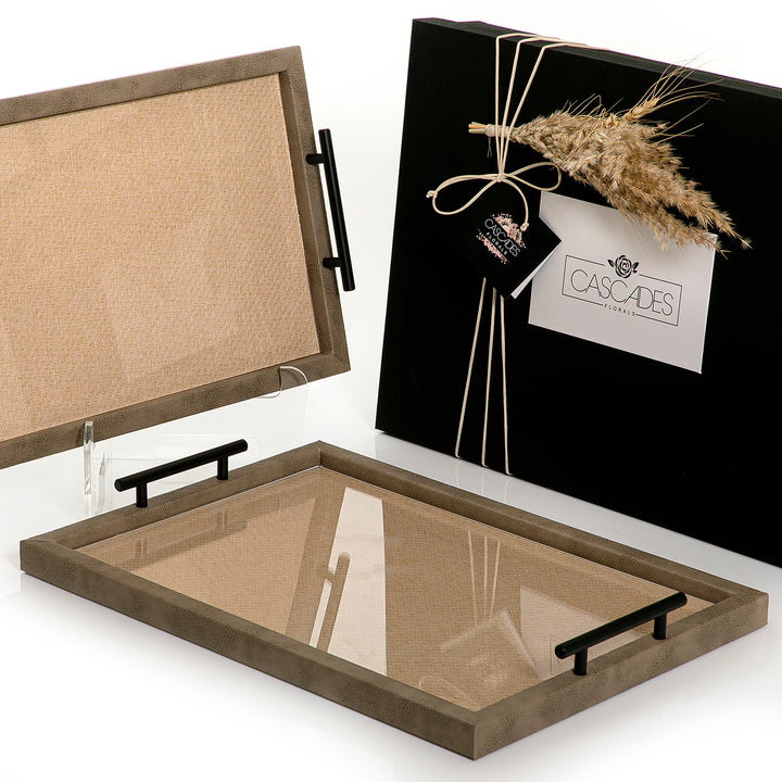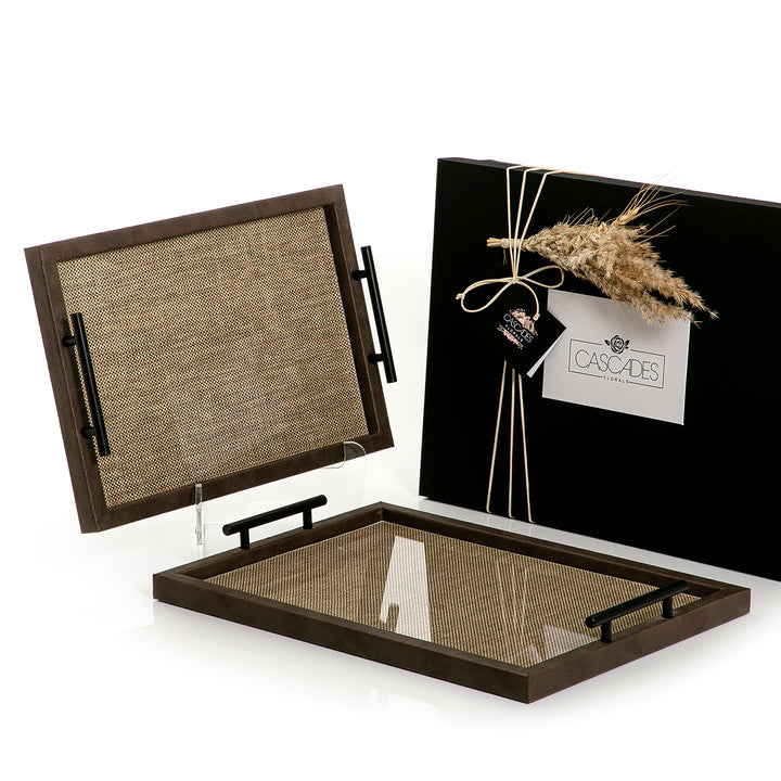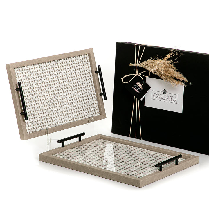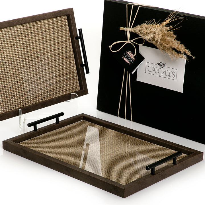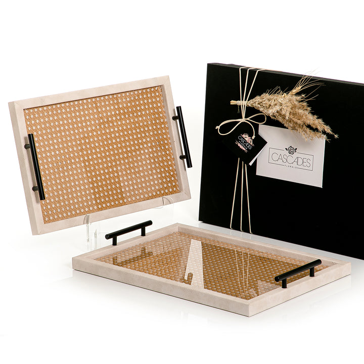 An Elegant Set Of Two Trays Made Of Leather And Rattan And removable Acrylic With A Gift Box .