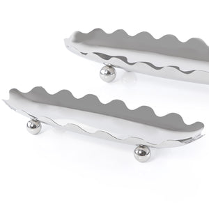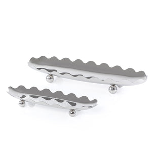 Elevate your table presentation with this sophisticated set of two oval metal stands featuring distinctive wavy edges. Crafted in lustrous silver, these versatile pieces seamlessly transition from everyday dining to special occasions. The elegant curved design adds visual interest while the sturdy metal construction ensures lasting durability. Perfect for displaying appetizers, desserts, or decorative arrangements, each stand offers a refined aesthetic that complements any décor. Arrives beautifully packaged in a gift box, making it an ideal present for those who appreciate quality serveware and timeless design.