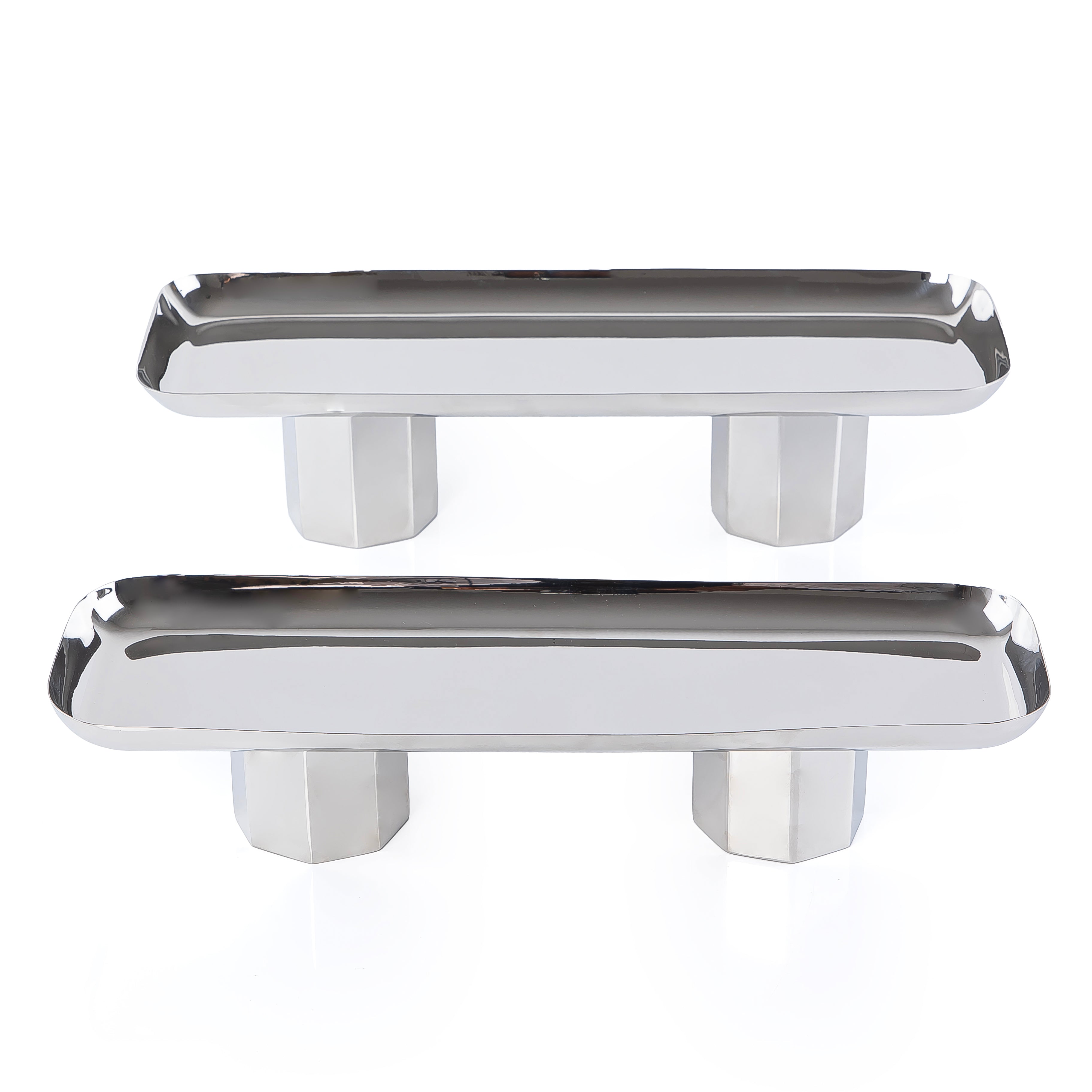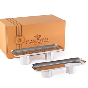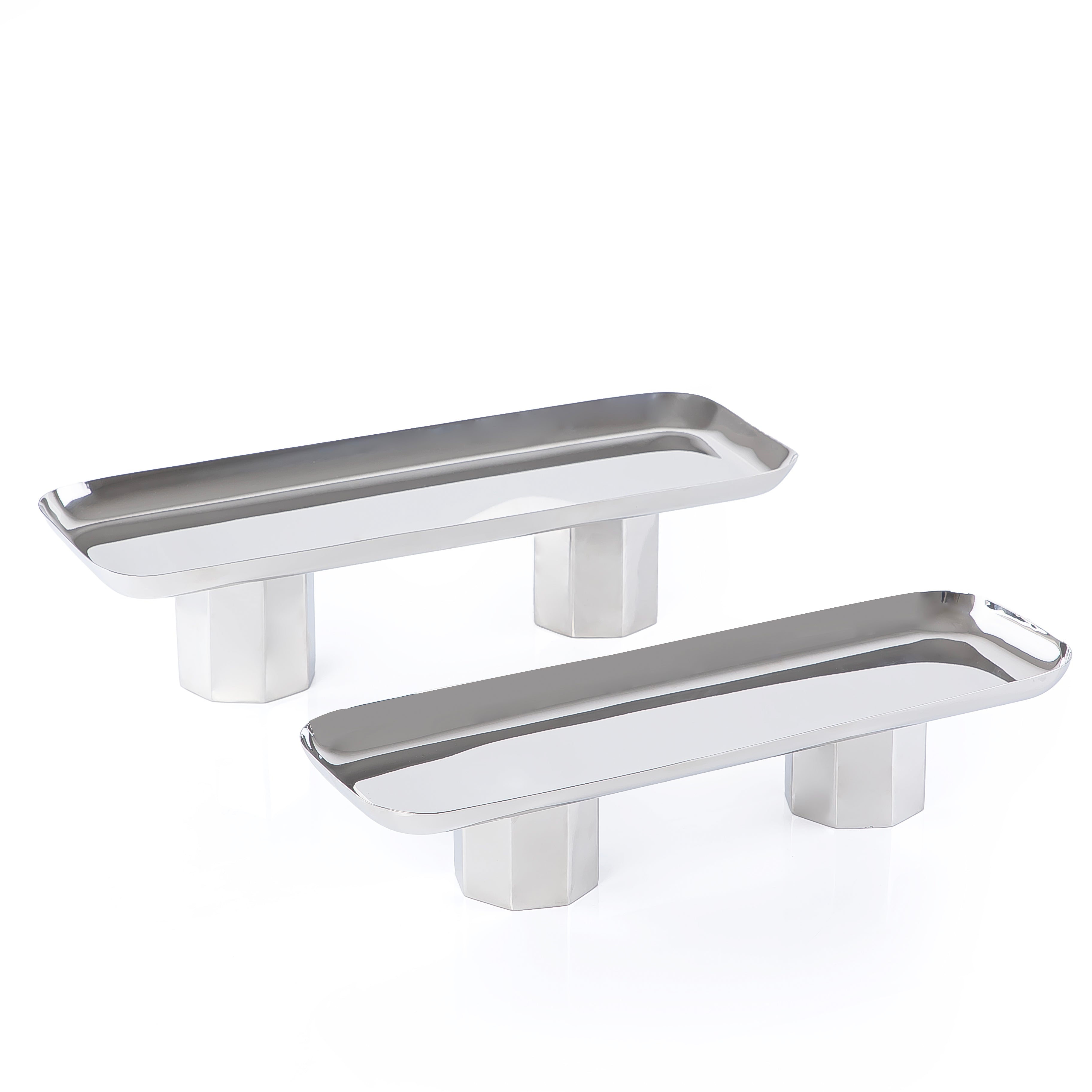 Transform your entertaining experience with this elegant set of two rectangular silver metal serving stands. Designed with sturdy legs to provide reliable support, these pieces help you create beautifully styled displays for any gathering. Whether you're showcasing appetizers, desserts, or decorative elements, these stands bring a touch of sophistication to your table. The timeless silver finish complements any décor style, making them a versatile choice for both everyday use and special occasions. Comes thoughtfully packaged in a gift box, perfect for gifting or personal enjoyment.