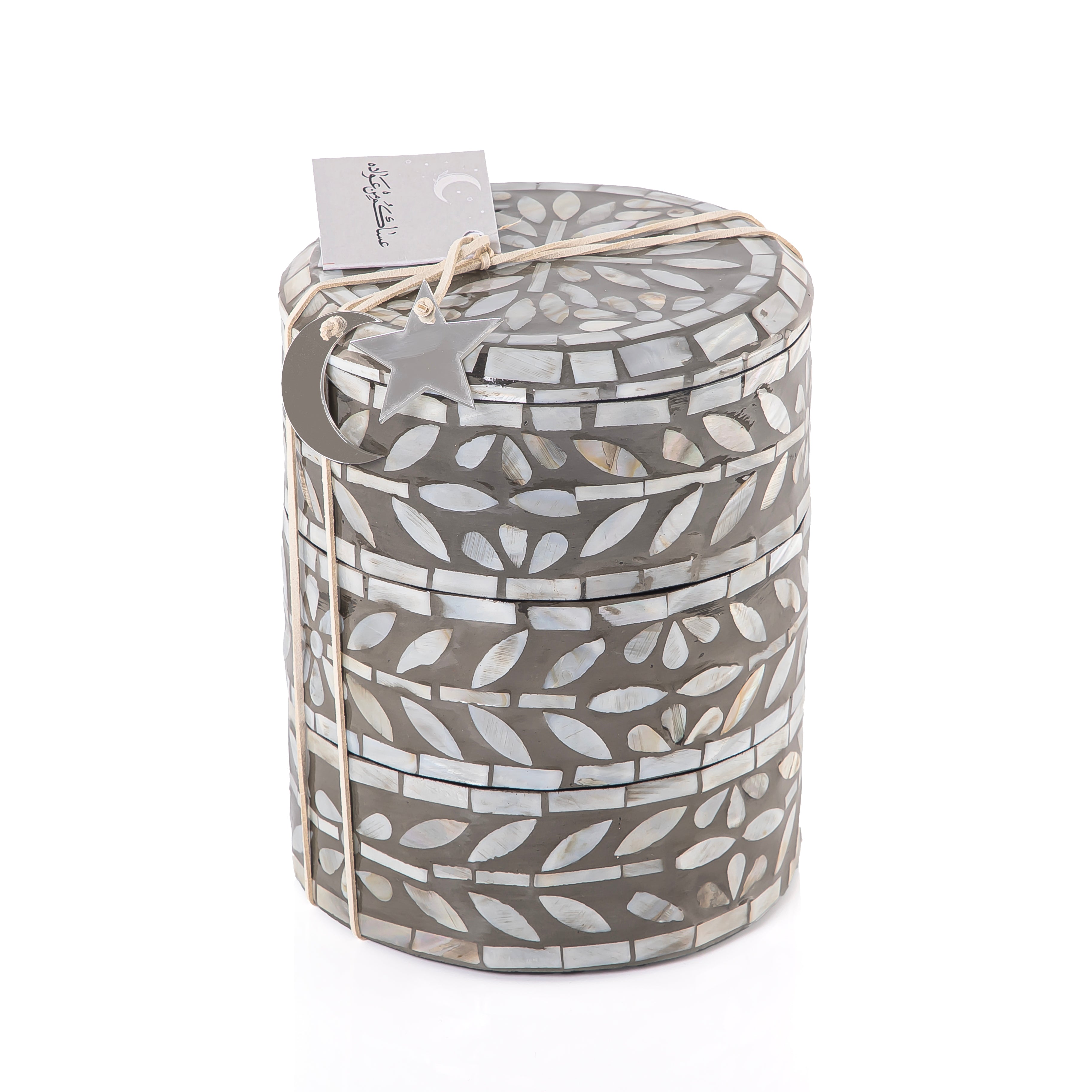 A stylish 3-story box with a grey finish, crafted from MDF and MOP. This compact storage solution features a cover and is perfect for organizing your essentials.