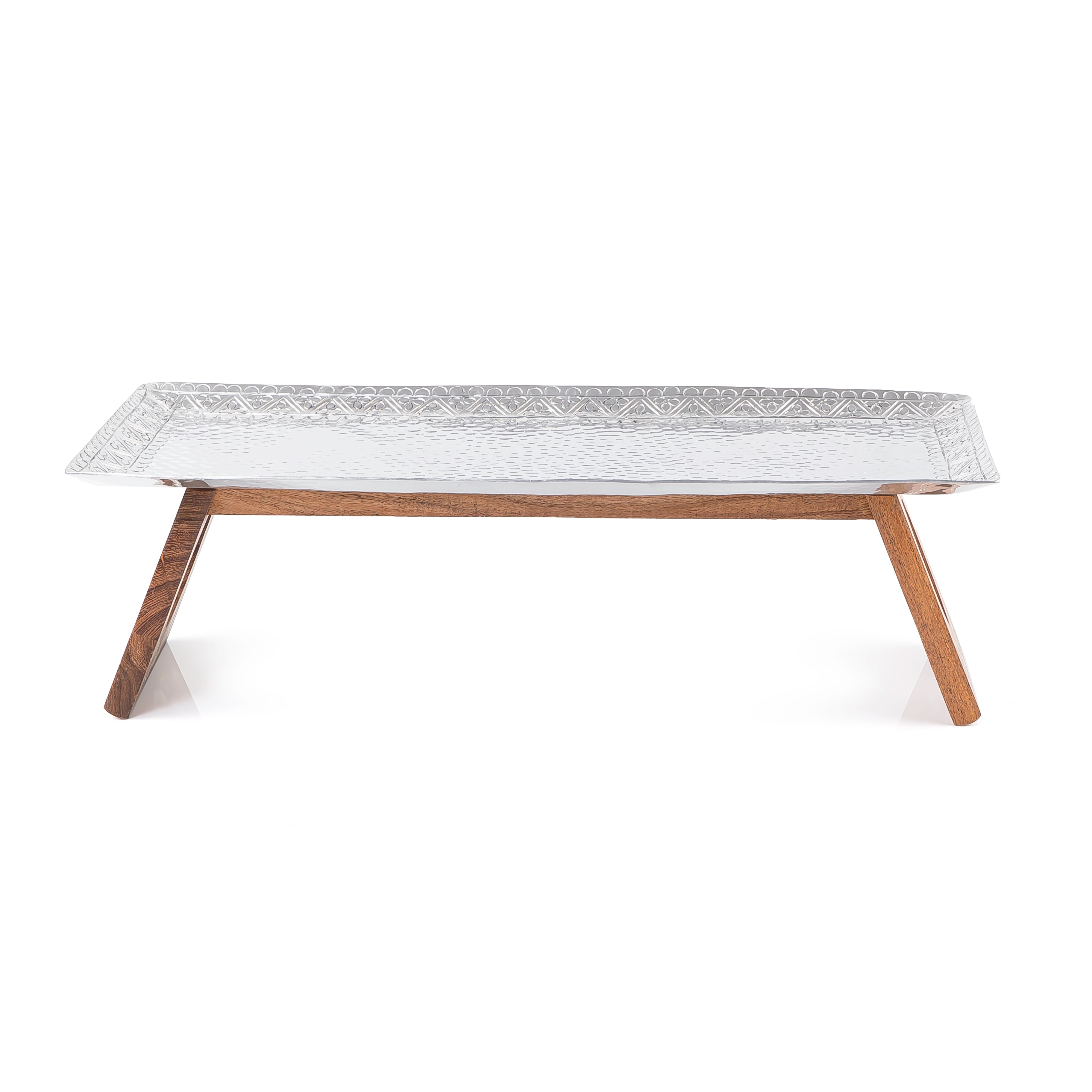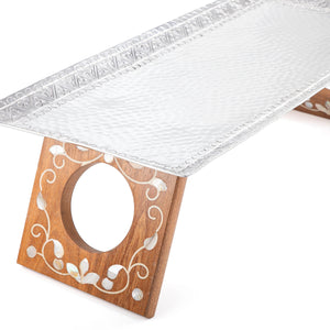 Increase your home's elegance with this rectangle Aluminium Tray with MOP wood Stand. It features a luxurious marble handle for easy carrying and a sophisticated touch. Ideal for serving or organizing, it adds both style and functionality to any space.