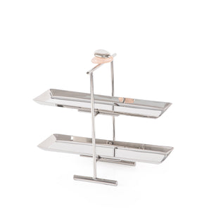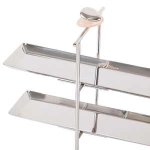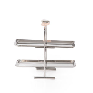 A stainless steel serving stand with two elevated tiers, offering a practical design for an organized presentation.