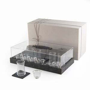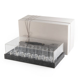 صينية تقديم مصنوعة من الخشب ومغطاة بطبقة من الجلد، مزودة بغطاء أكريليك شفاف ومقبض مريح. الطقم يشمل 6 أكواب شاي و 6 فناجيل قهوة، كوسترات، وعلبة إضافية، ويأتي في بوكس هدية.