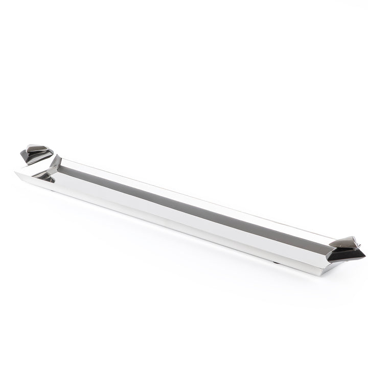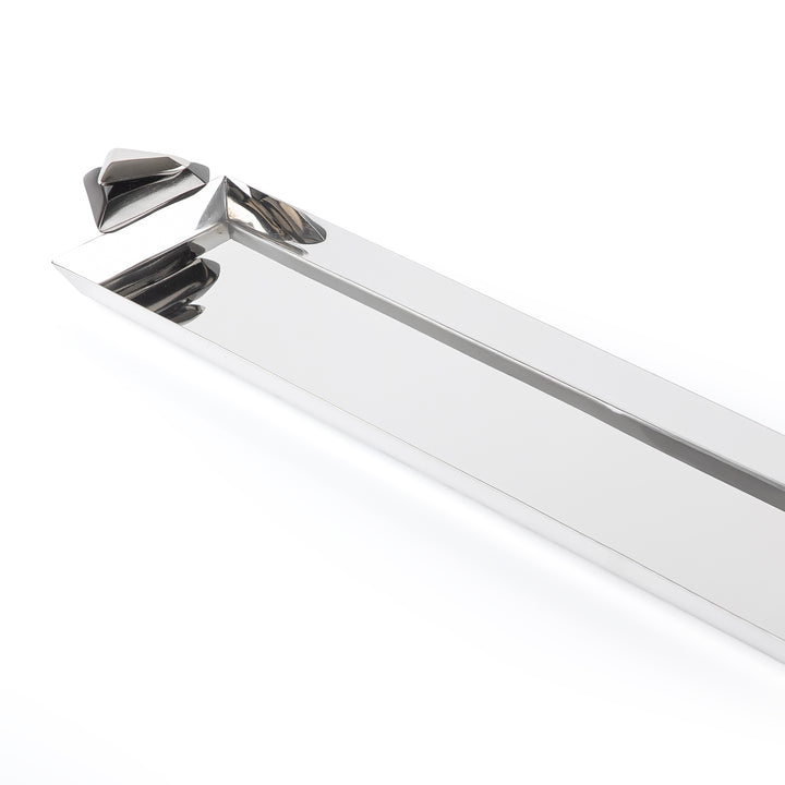 ارتقِ بعرض مائدتك مع هذه الصينية المعدنية الطويلة الأنيقة، المصممة ببراعة وبلمسة نهائية مميزة باللونين الفضي والأسود.