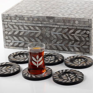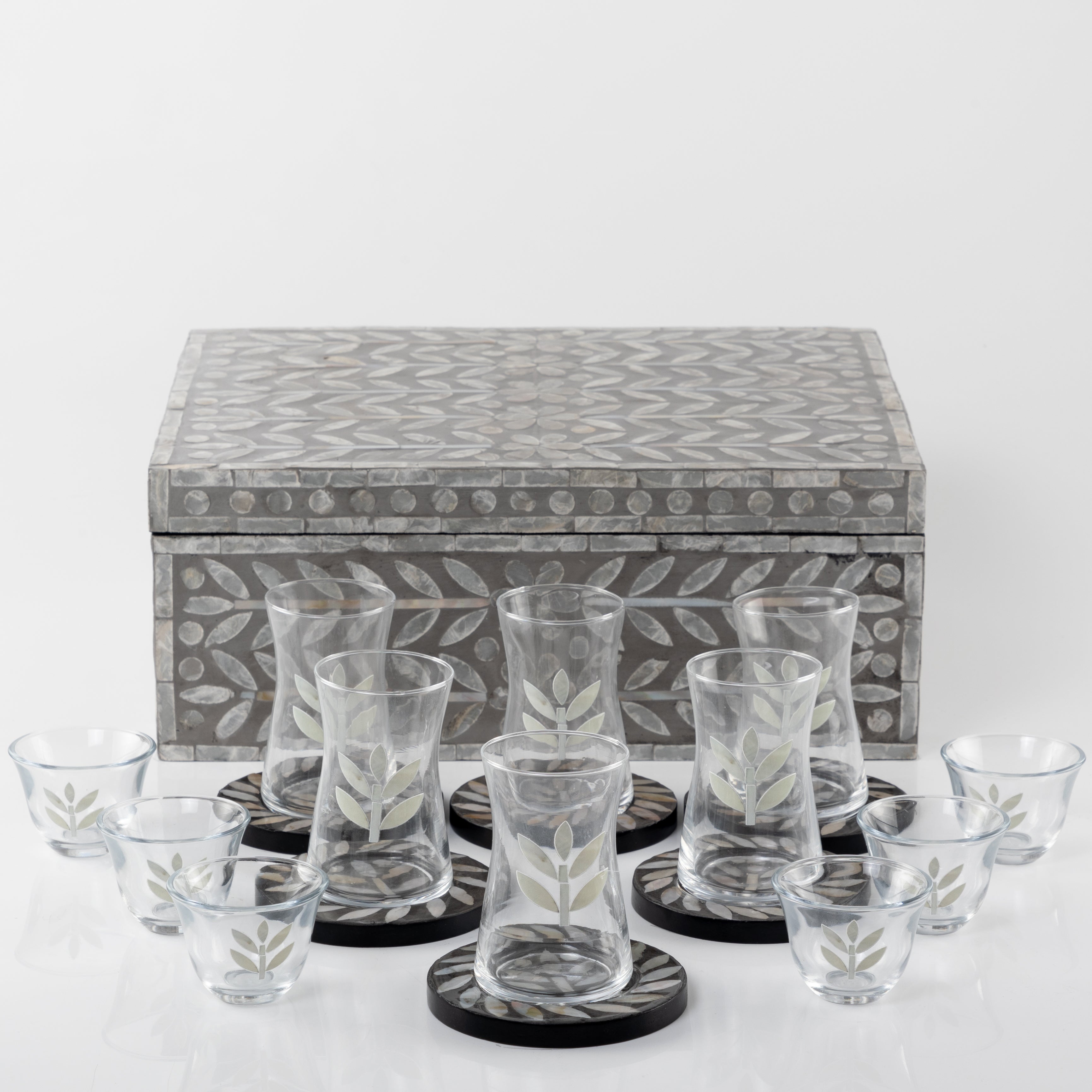 طقم صدف مكون من 12 قاعدة أكواب مع 6 أكواب للقهوة و 6 أكواب للشاي مع بوكس - رمادي