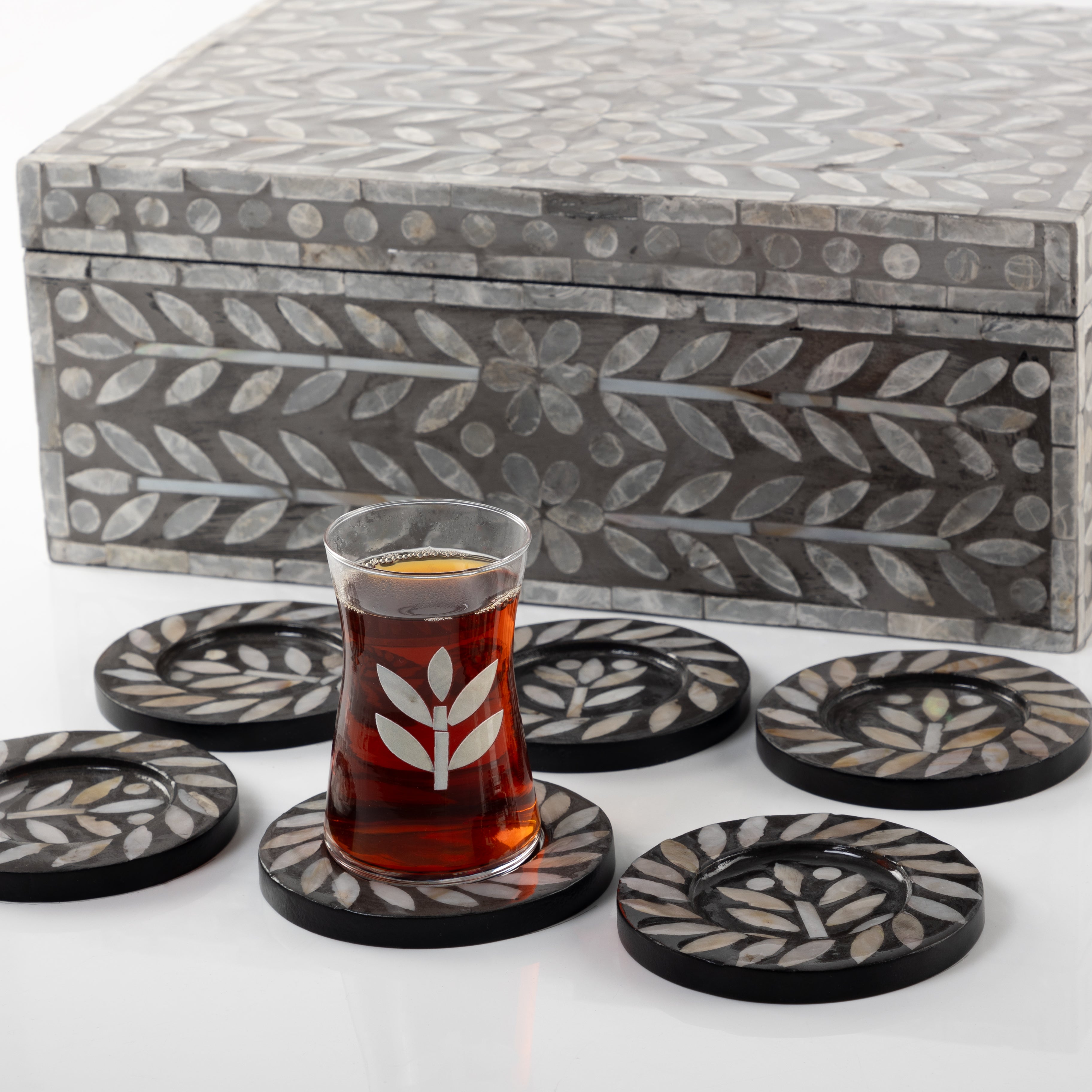 ارتقِ بتجربة تقديم مشروباتك مع طقم الأكواب والقواعد الأنيق المصنوع من عرق اللؤلؤ. تتضمن هذه المجموعة الشاملة اثني عشر قاعدة أكواب لامعة مع ستة فناجين قهوة وستة فناجين شاي، كل قطعة تُبرز اللمعان الطبيعي لعرق اللؤلؤ. تصميم أنيق يُناسب الاستخدام اليومي العادي والمناسبات الرسمية. يأتي هذا الطقم في علبة هدايا فاخرة، ويُعدّ خيارًا استثنائيًا لعشاق أدوات المائدة الفاخرة واللمسات الجمالية الخالدة. مثالي لإضفاء لمسة من الفخامة على مائدتك، يُبهر ضيوفك، مع حماية الأسطح بأناقة راقية.