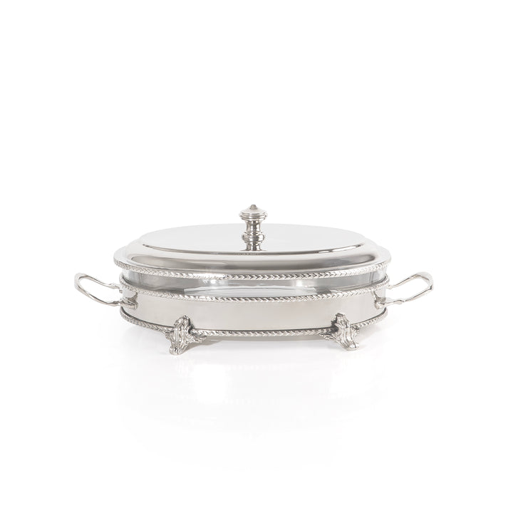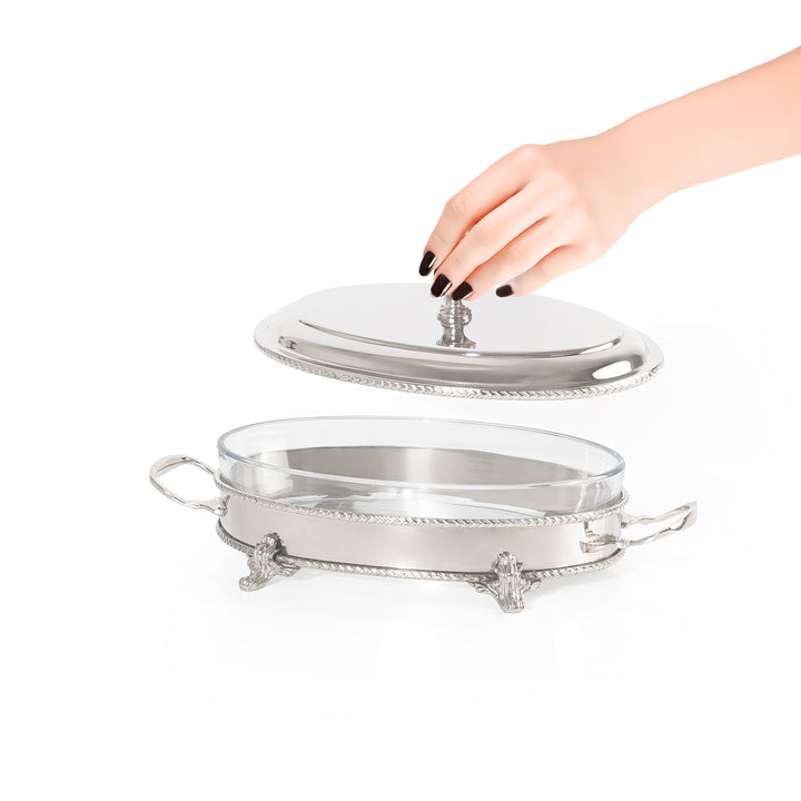 قدّم أطباقك بأناقة مع سخان الطعام البيضاوي الصغير المصنوع من الستانلس ستيل الفضي، المزود بوعاء زجاجي داخلي قابل للإزالة لمرونة التقديم وسهولة التنظيف.