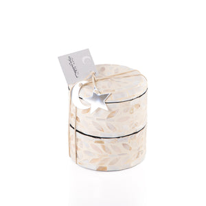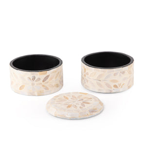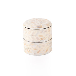 علبة من طبقتين بلمسة أنيقة رمادية، مصنوعة من خشب MDF والصدف. تُعد حلاً عمليًا ومضغوطًا للتخزين، وتتميز بغطاء مثالي لتنظيم أساسياتك.