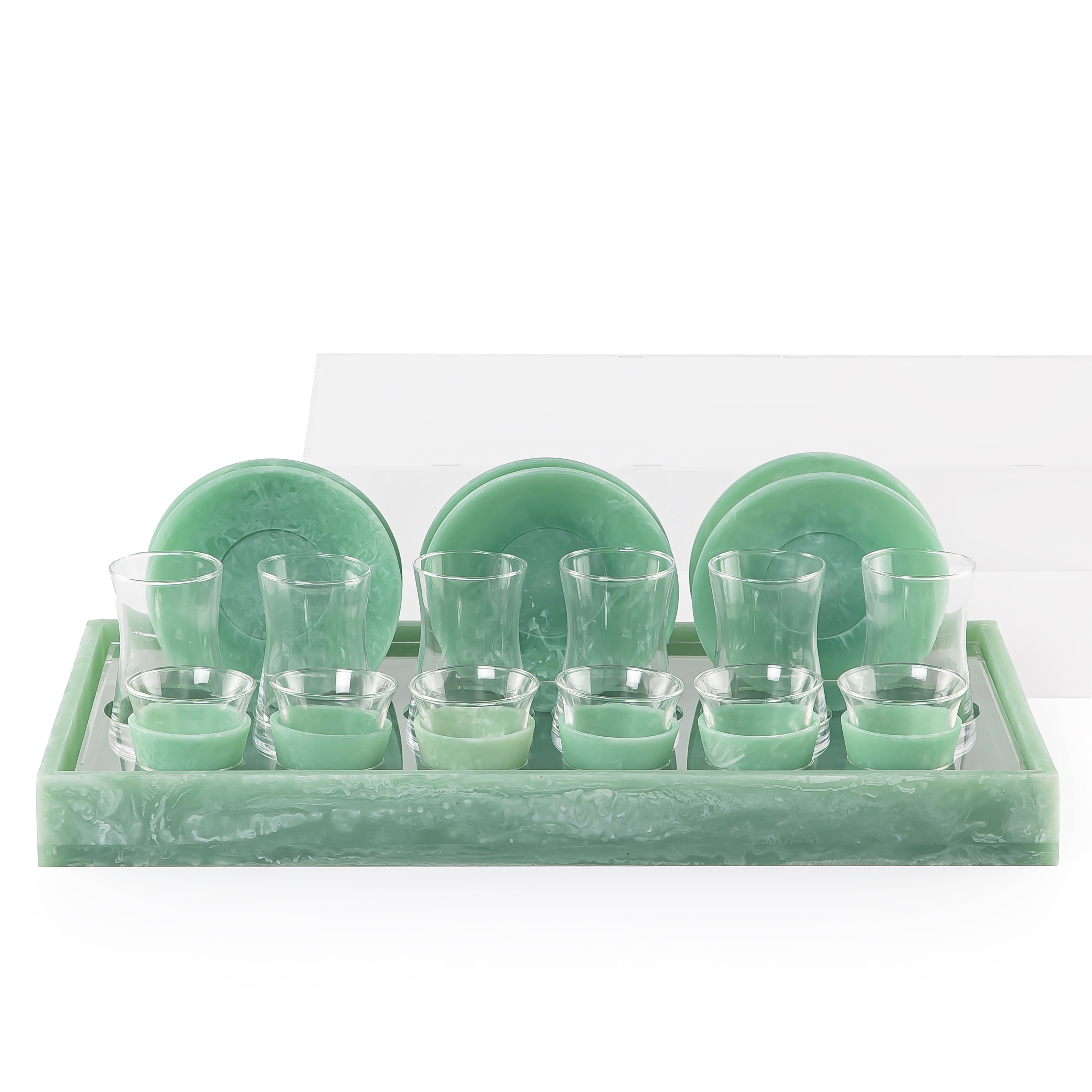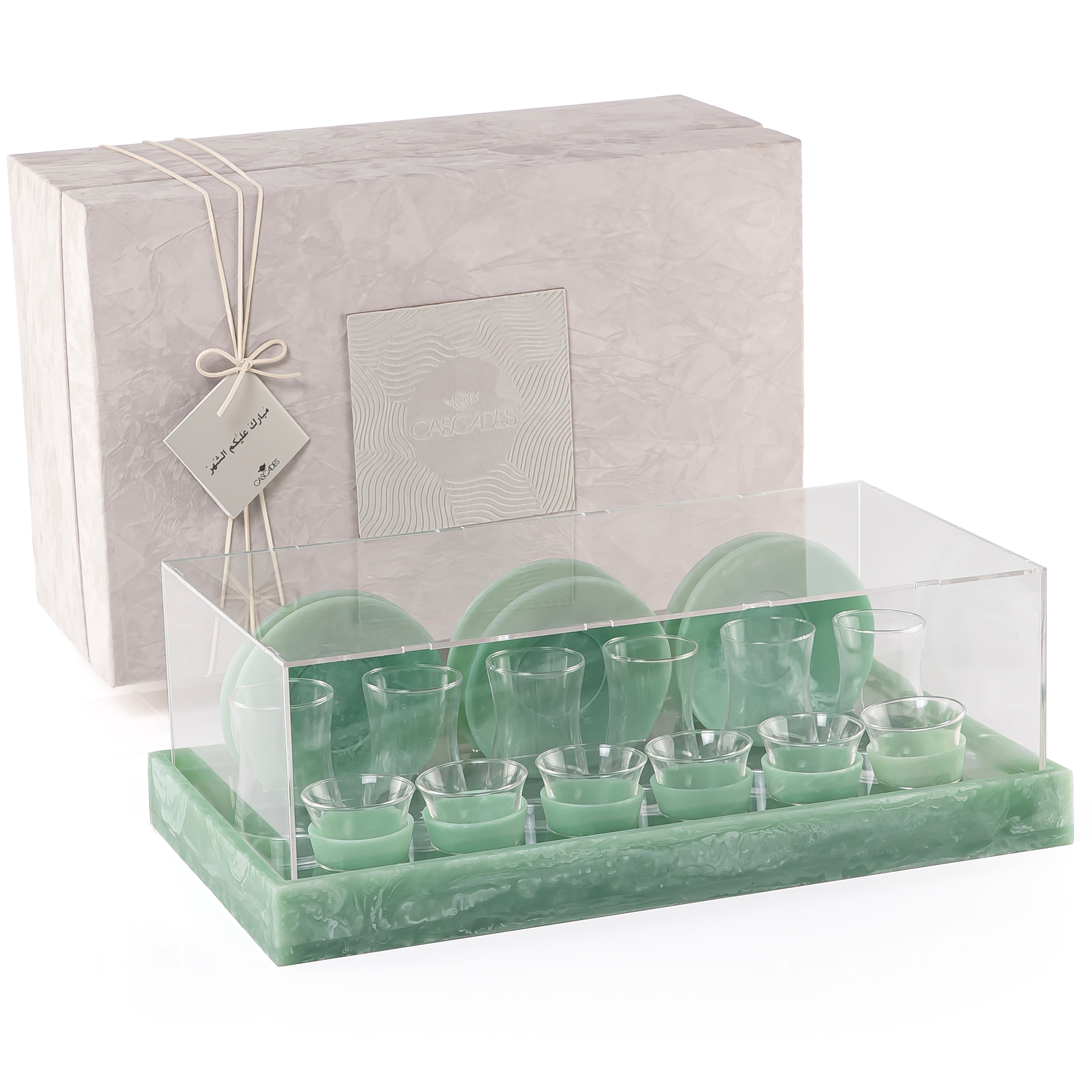طقم مكون من 12 إستيكانات وفناجين قهوة مع الأطباق وبوكس هدايا - أخضر