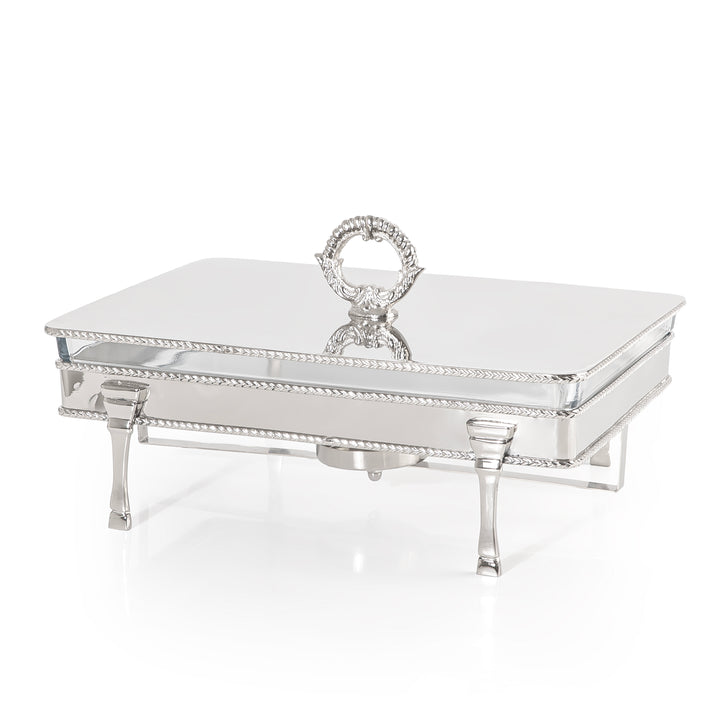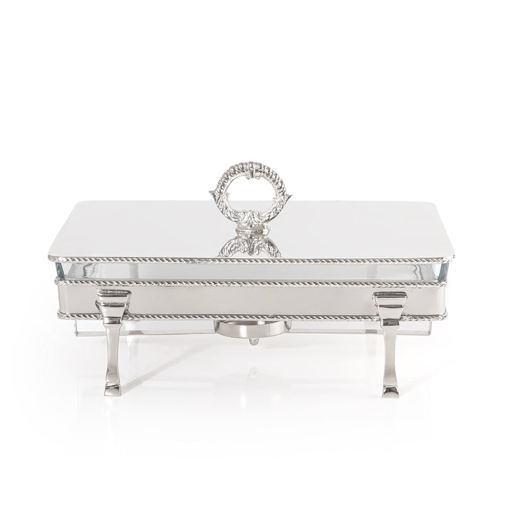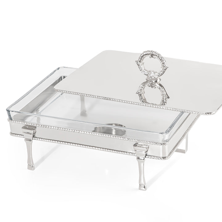 ارتقِ بتجربة تقديم الطعام مع سخان الطعام المستطيل الكبير المصنوع من الستانلس ستيل الفضي، المزود بوعاء زجاجي داخلي قابل للإزالة لمرونة التقديم وسهولة التنظيف، بالإضافة إلى مقبض مريح لتسهيل الحمل والاستخدام.