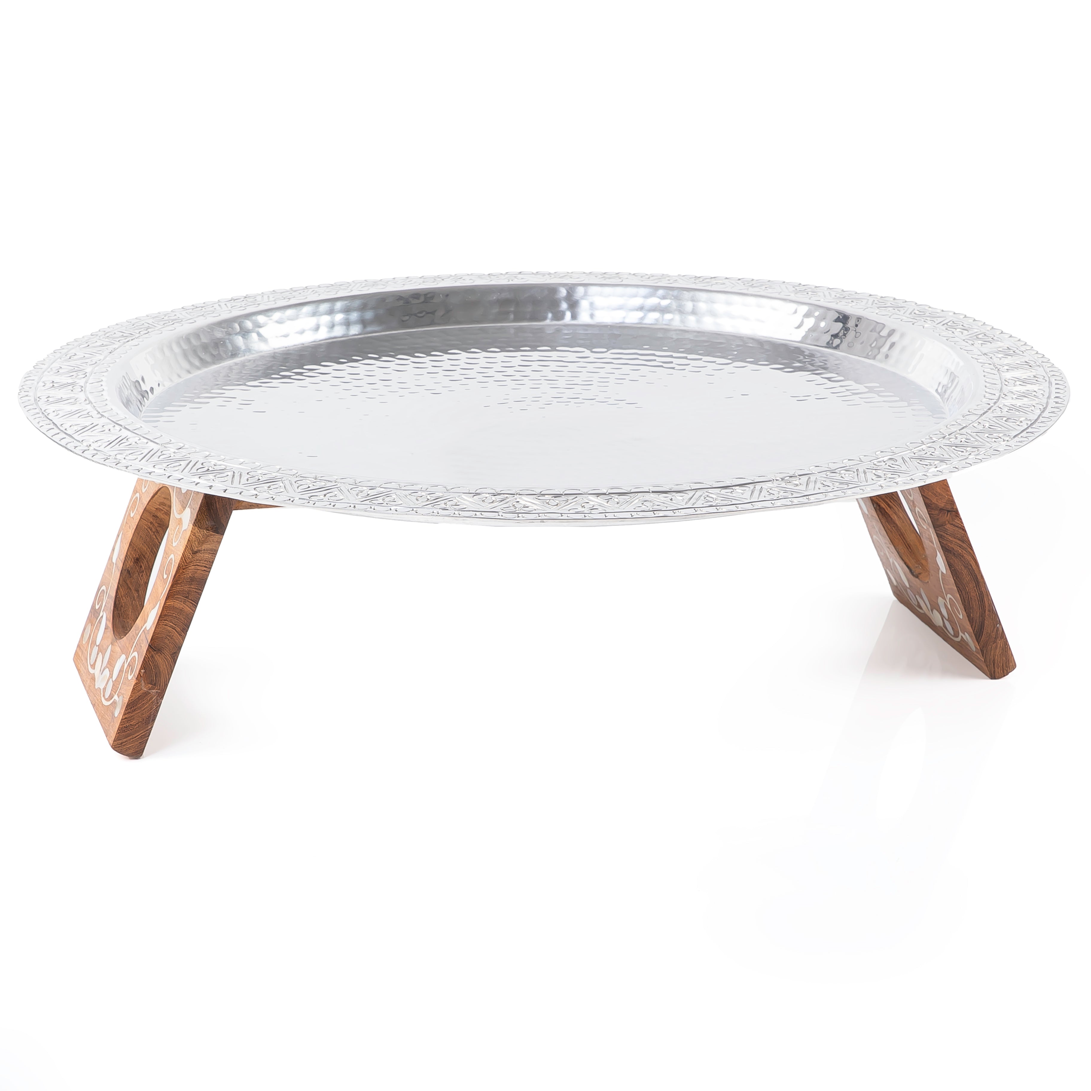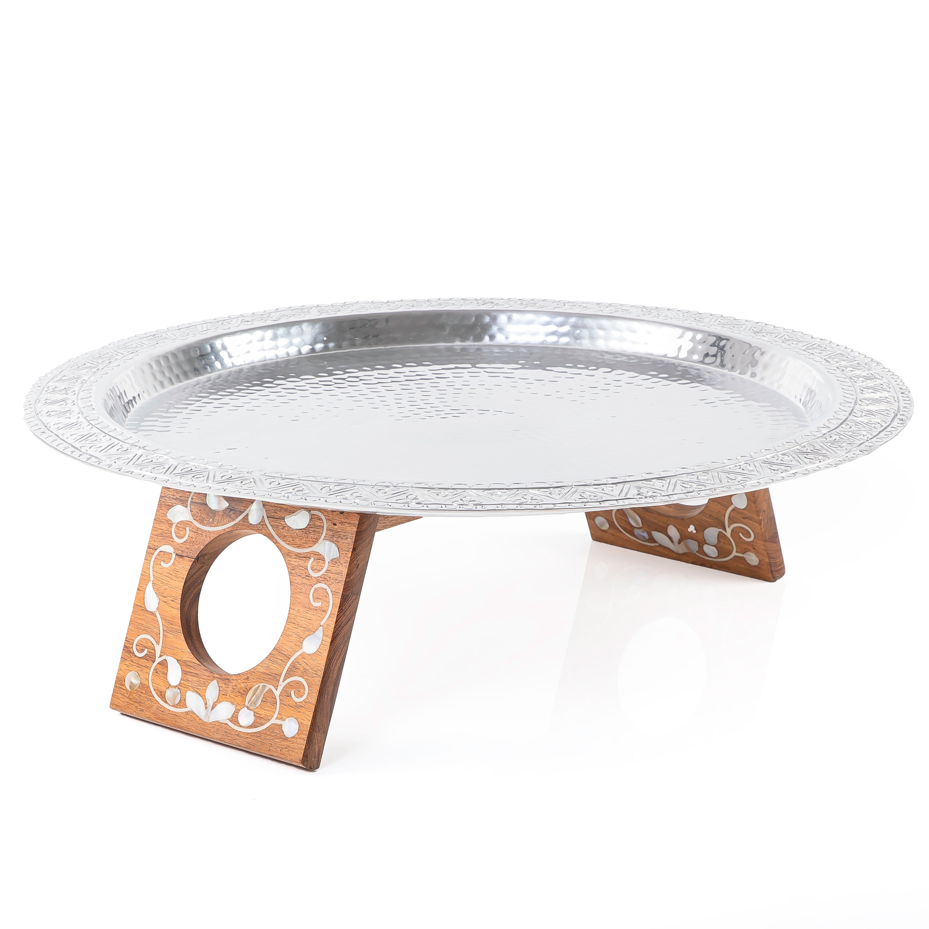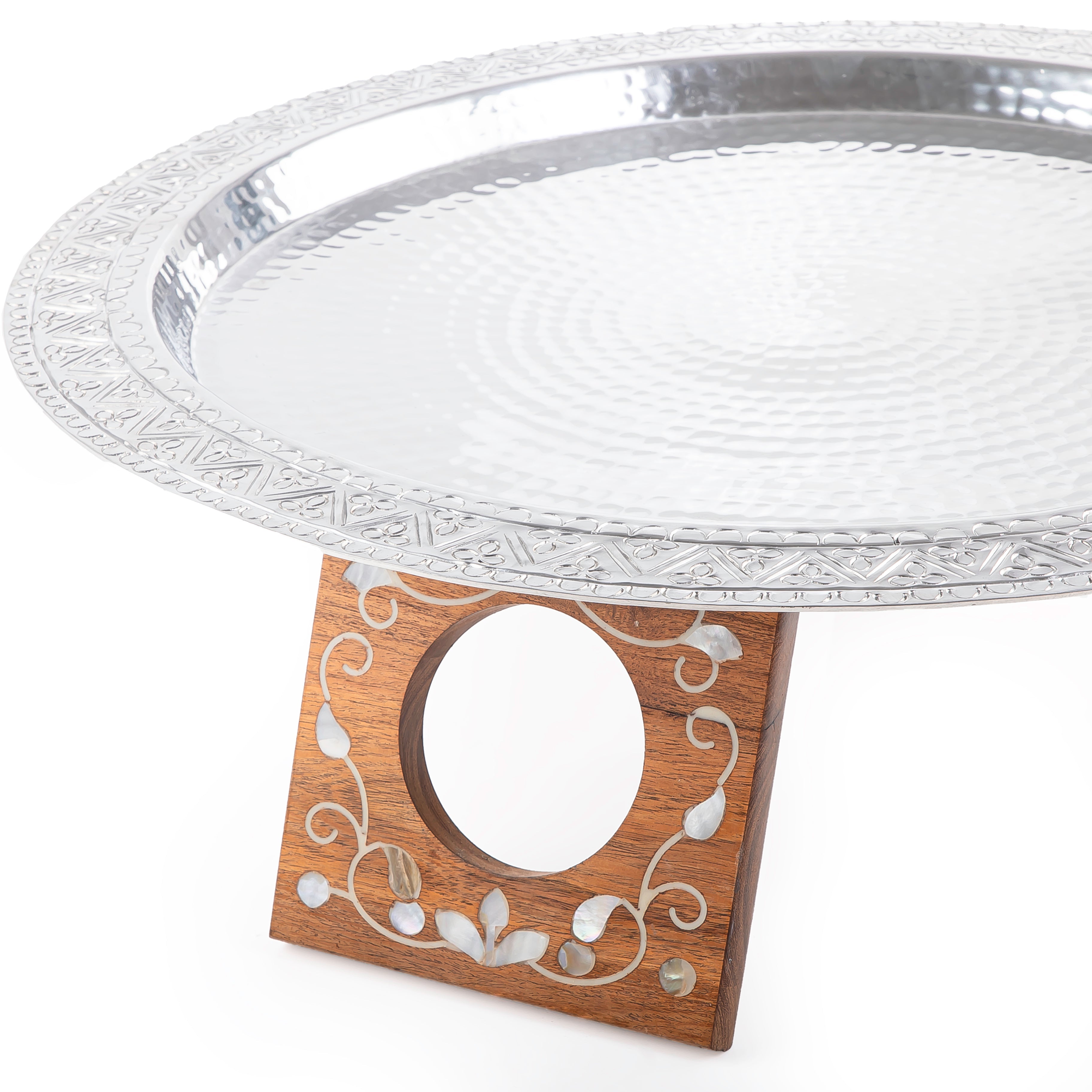 هذه الصينية الأنيقة المصنوعة من الألومنيوم مع حامل خشب الأصداف (MOP) بحجم كبير ستكون إضافة لافتة للنظر لأي طاولة. تصميمها من الألومنيوم عالي الجودة يوفر المتانة وأناقة خالدة ستدوم لسنوات. هذه الصينية عنصر أساسي لأي منزل.