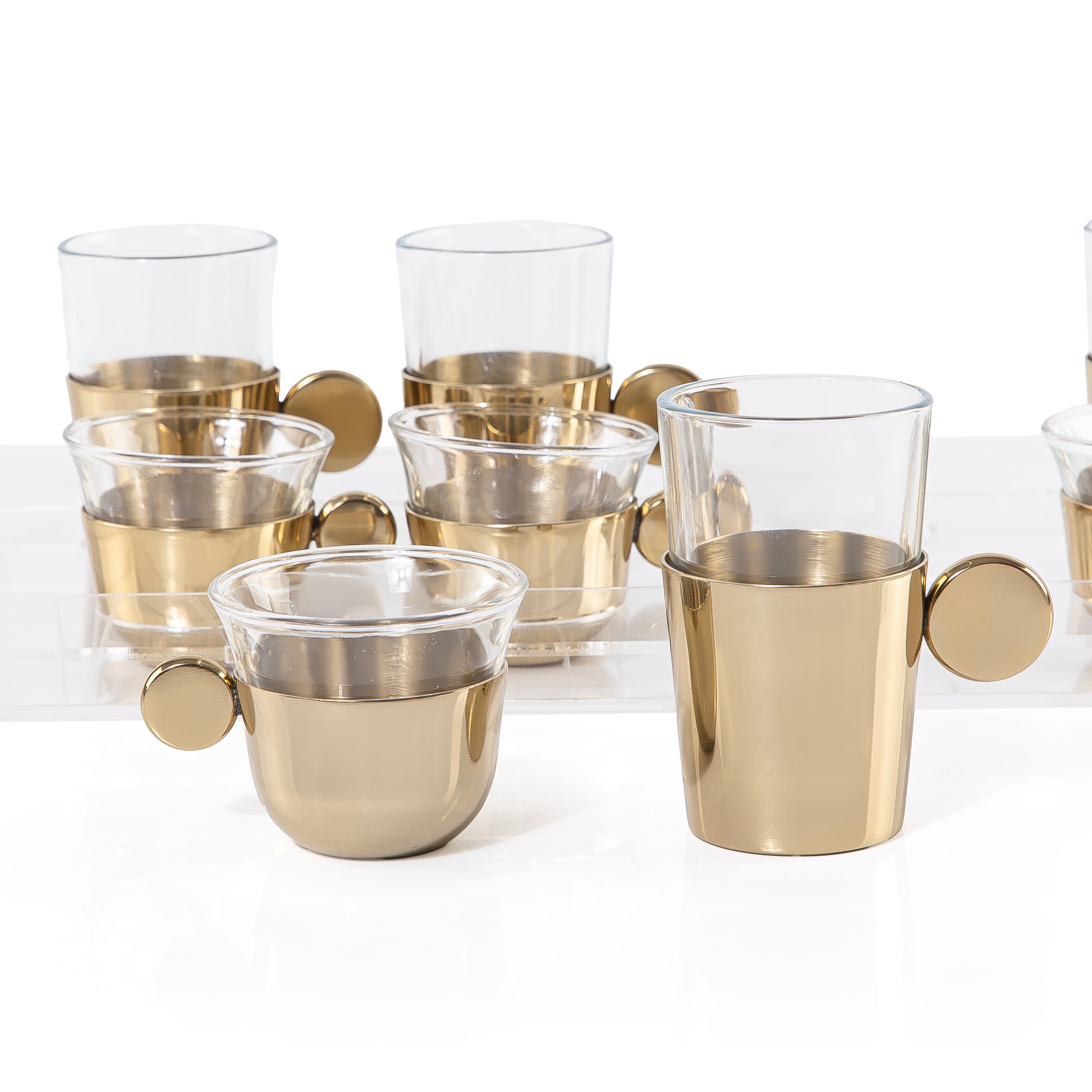 Chose the option: طقم مكون من 4 قطع من ستيكانا الشاي و4 فناجين قهوة عربية بمقابض أنيقة - ذهبي