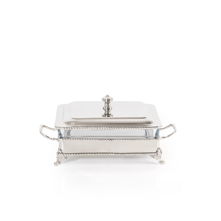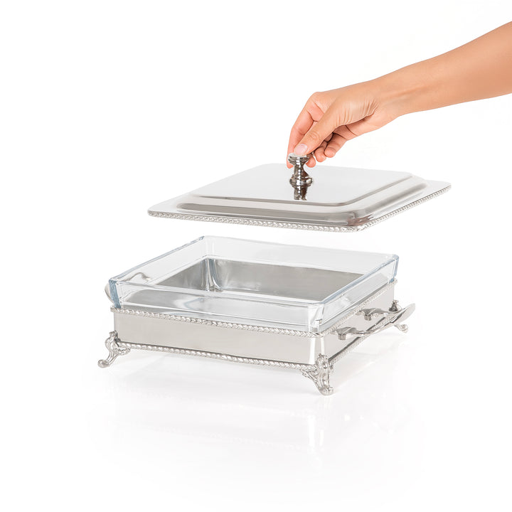 ارتقِ بتجربة تقديم الطعام مع سخان الطعام المربع المصنوع من الستانلس ستيل الفضي، المزود بوعاء زجاجي داخلي قابل للإزالة لمرونة التقديم وسهولة التنظيف.