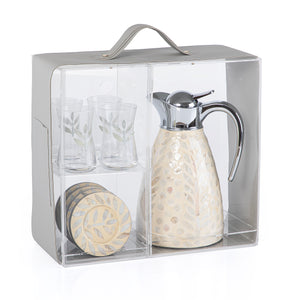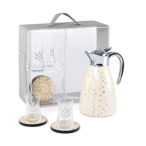 Mother of Pearl Thermos Set with 4 Glass Tea Cups & 4 Saucers in Acrylic Box - Cream