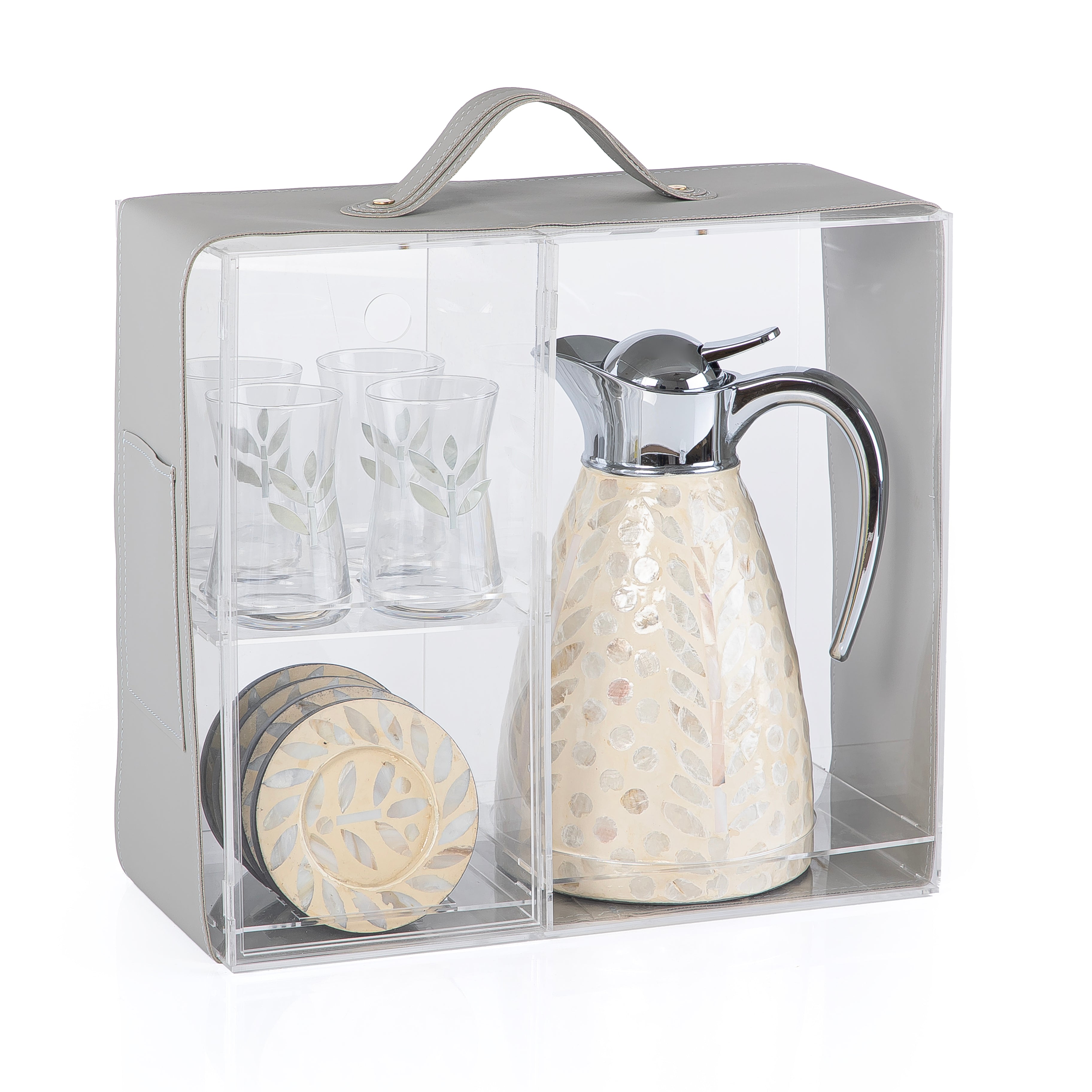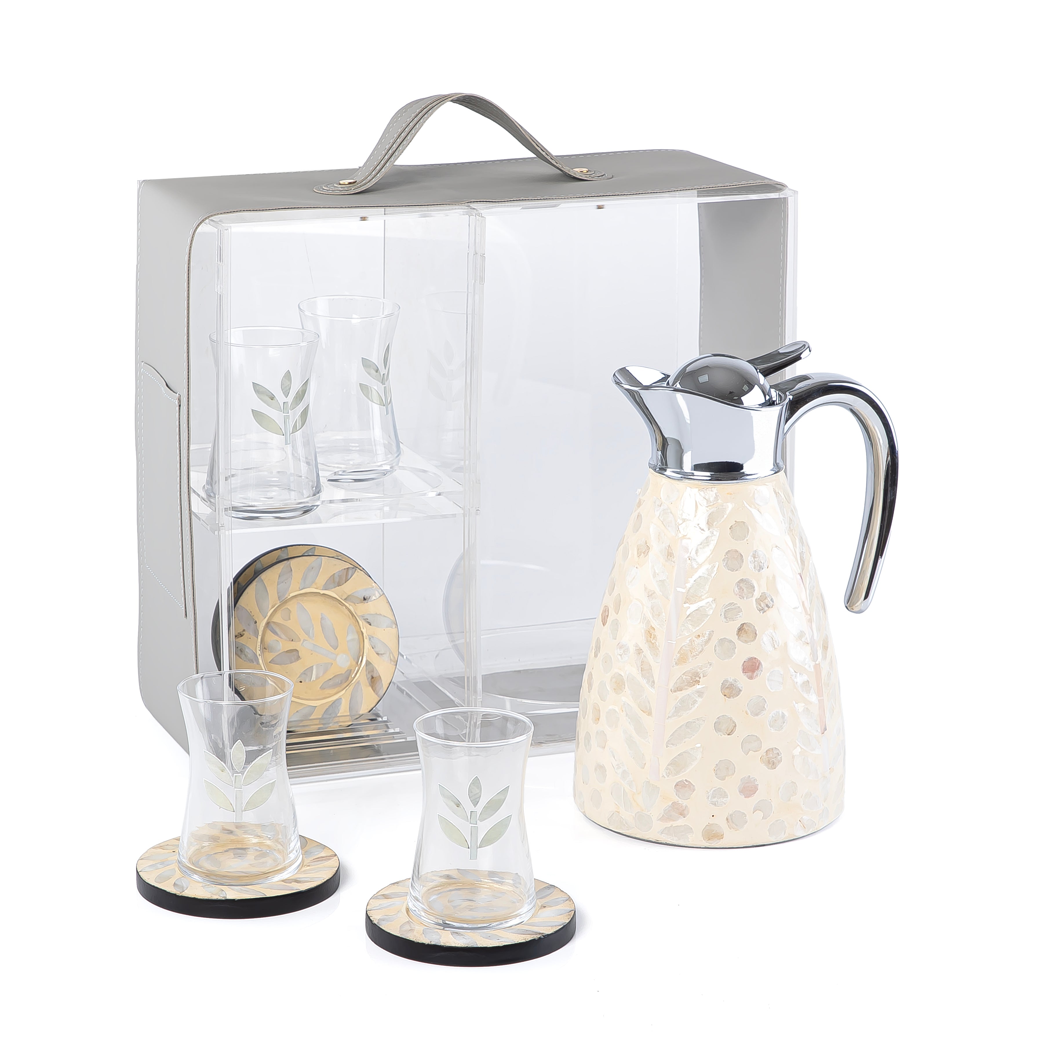 Mother of Pearl Thermos Set with 4 Glass Tea Cups & 4 Saucers in Acrylic Box - Beige