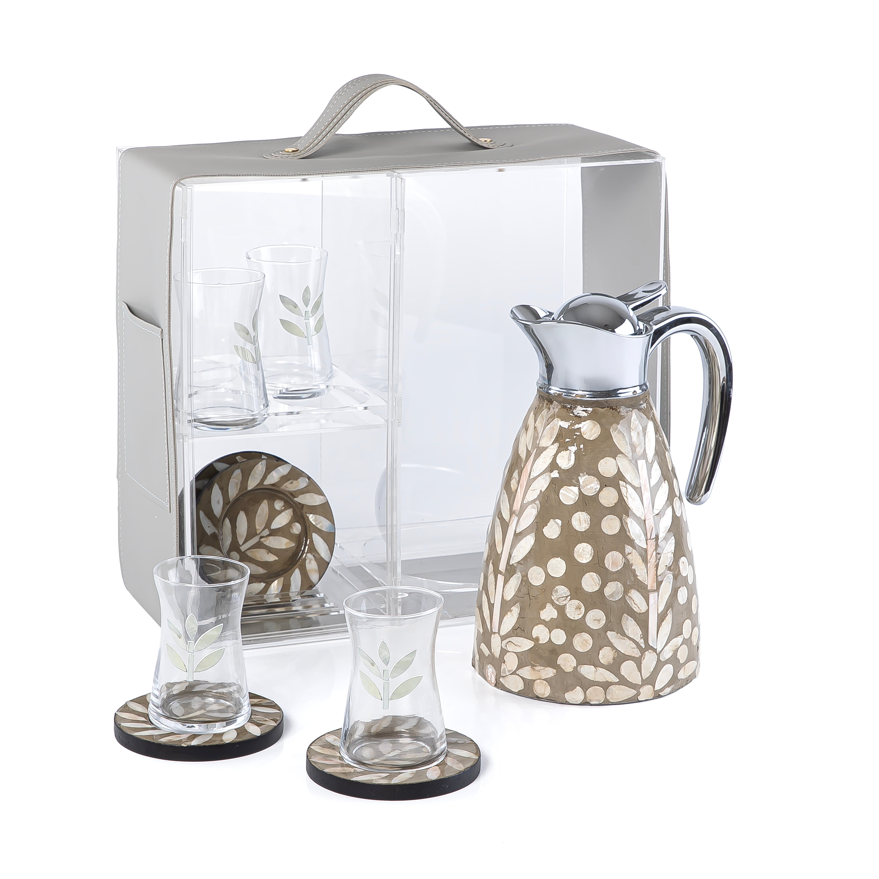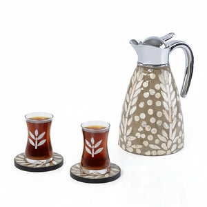 Mother of Pearl Thermos Set with 4 Glass Tea Cups & 4 Saucers in Acrylic Box - Beige