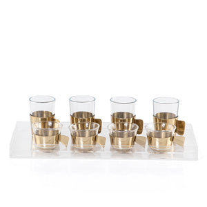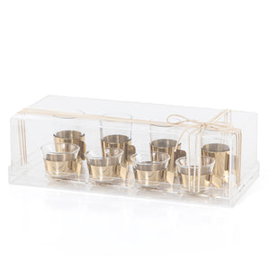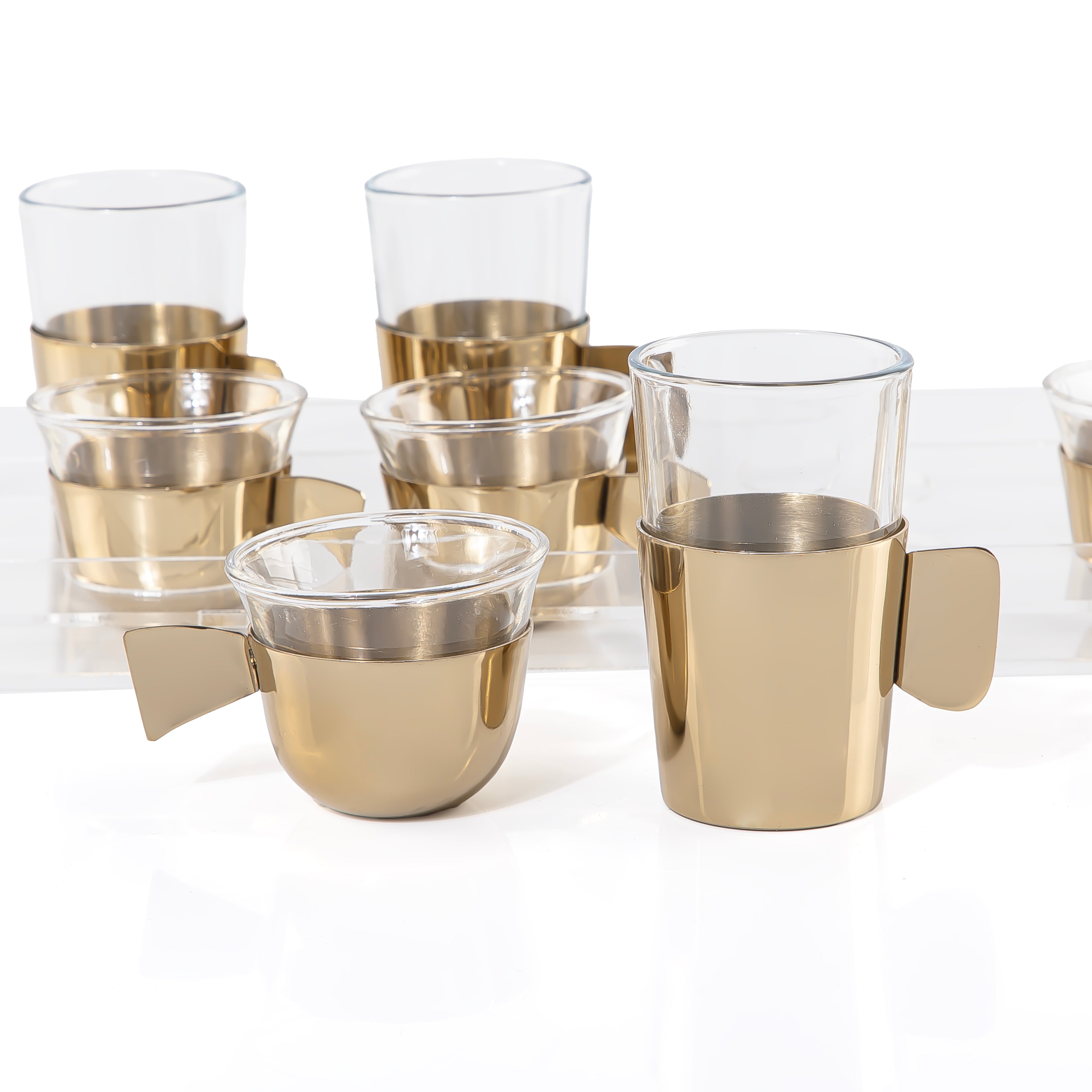 طقم 8 كاسات شاي وقهوة مع حوامل معدنية باللون الذهبي و بوكس أكريليك شفاف